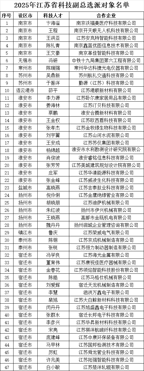 江苏省科技副总由省委人才办、省科技厅、省教育厅联合选派,其目的在于充分发挥人才第一资源作用,推动科技创新和产业创新深度融合,引导更多科技人才服务我省产业创新发展,提高科技成果转化和产业化水平,聚力打造具有全球影响力的产业科技创新中心,加快成为发展新质生产力的重要阵地。据悉,2025年共有2333名省内外科技人才被选派为江苏省科技副总。