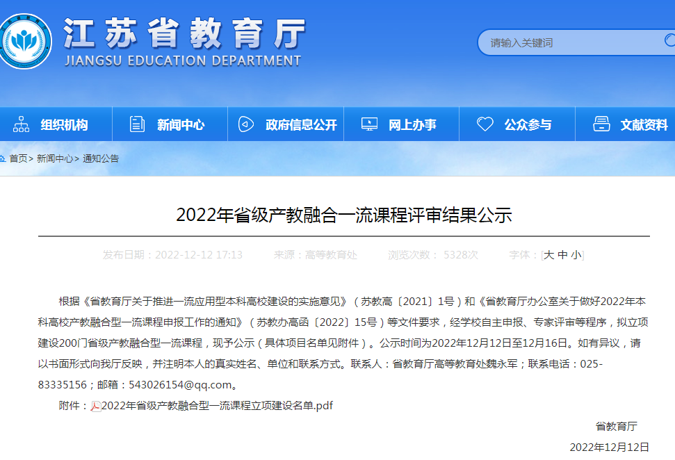 近日,江苏省教育厅公布了2022年省级产教融合一流课程评审结果公示。我校《单片机原理及接口技术》、《化工工艺学(双语)》、《混凝土结构基本原理2》、《汽车试验学》、《食品安全学》5门课程获批立项2022年省级产教融合型一流课程。