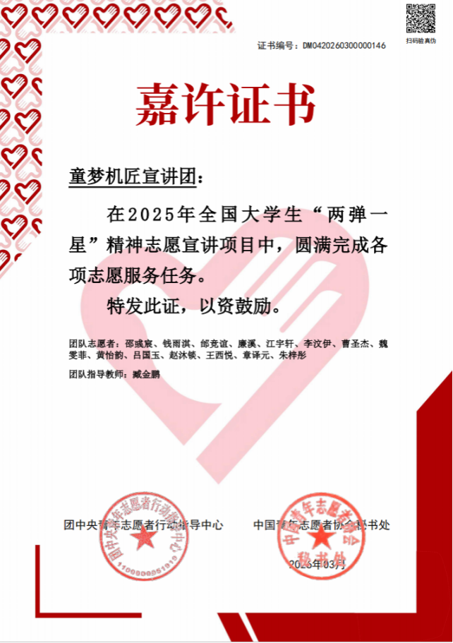 近日,团中央青年志愿者行动指导中心、中国青年志愿者协会秘书处公布2025年全国大学生“两弹一星”精神志愿宣讲项目评选结果。我校机械与材料工程学院“童梦机匠宣讲团”凭借扎实的宣讲成效、创新的服务模式,从全国1500支立项团队中脱颖而出,成功获评全国嘉许团队,全国仅100支队伍获此荣誉。