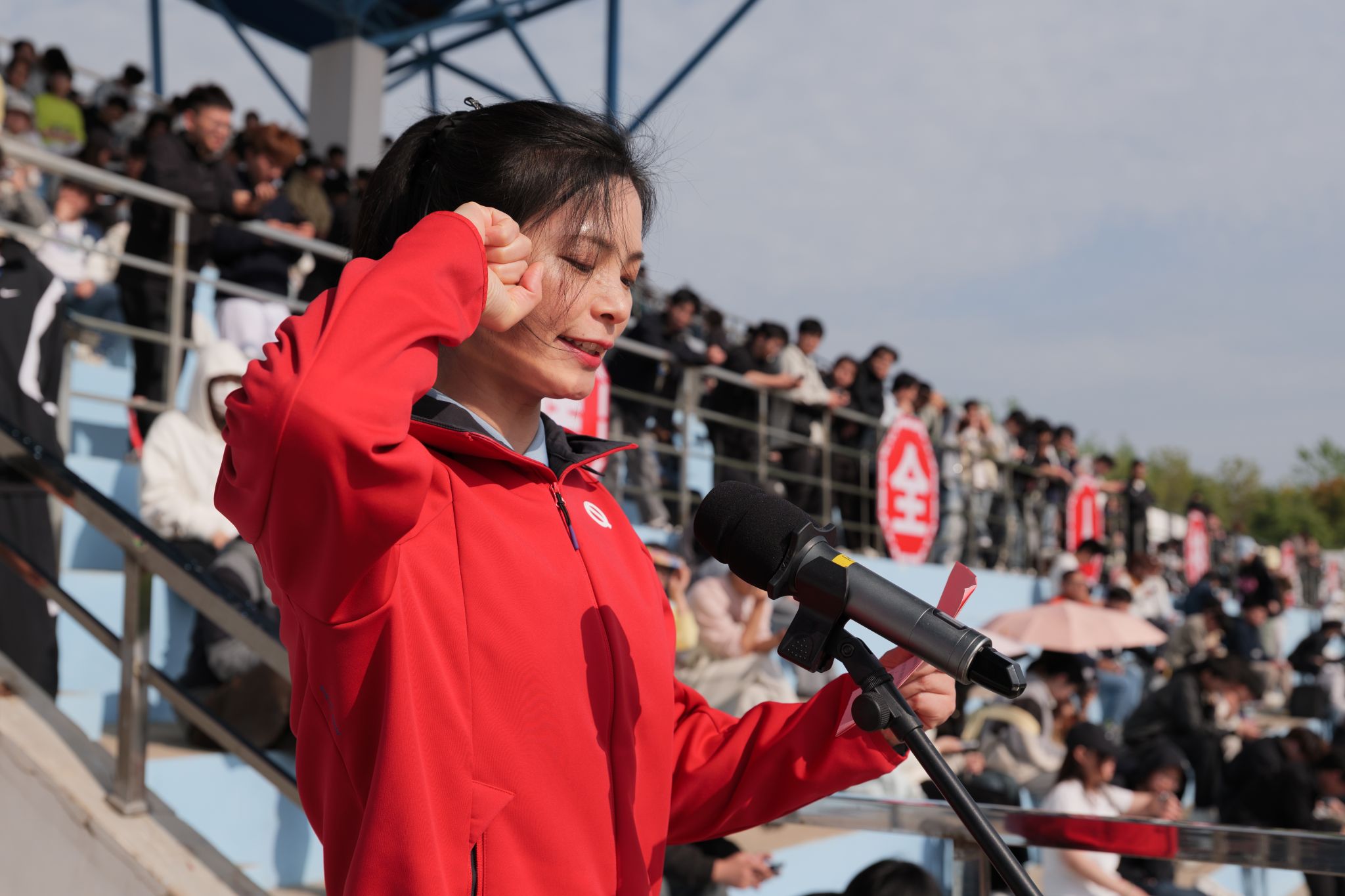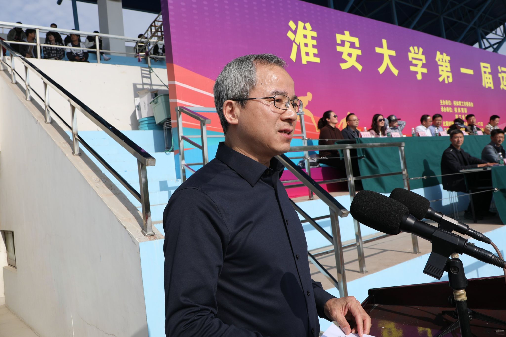 郑锋指出,本次运动会是学校更名淮安大学后的第一届运动会,是学校体育事业发展史上的里程碑,也是全体淮大人精神风貌的集中展示。“第一届”意味着新的起点,标志着学校体育工作翻开了崭新的一页;“第一届”意味着新的气象,展现的是学校开放包容、昂扬向上的大学气质;“第一届”意味着新的使命,开启了学校培养全面发展时代新人的新篇章。他强调,体育能强健体魄,同学们要走下网络、走出宿舍、走向操场,让体育锻炼成为终身习惯;体育能磨砺意志,体育教会我们的不仅是赢,更是如何体面地输、如何从跌倒中站起、如何在极限中突破自我,这正是同学们走向社会后最宝贵的精神财富;体育能健全人格,同学们要在集体项目中学会协作,在规则约束下学会尊重,在公平竞争中学会坦荡。希望大家以本届运动会为新的起点,让体育锻炼成为日常习惯,让竞技赛场成为成长课堂,在运动中强健体魄、乐享青春,在比拼中磨砺意志、涵养品格,共同绘就淮安大学高质量发展的崭新篇章。