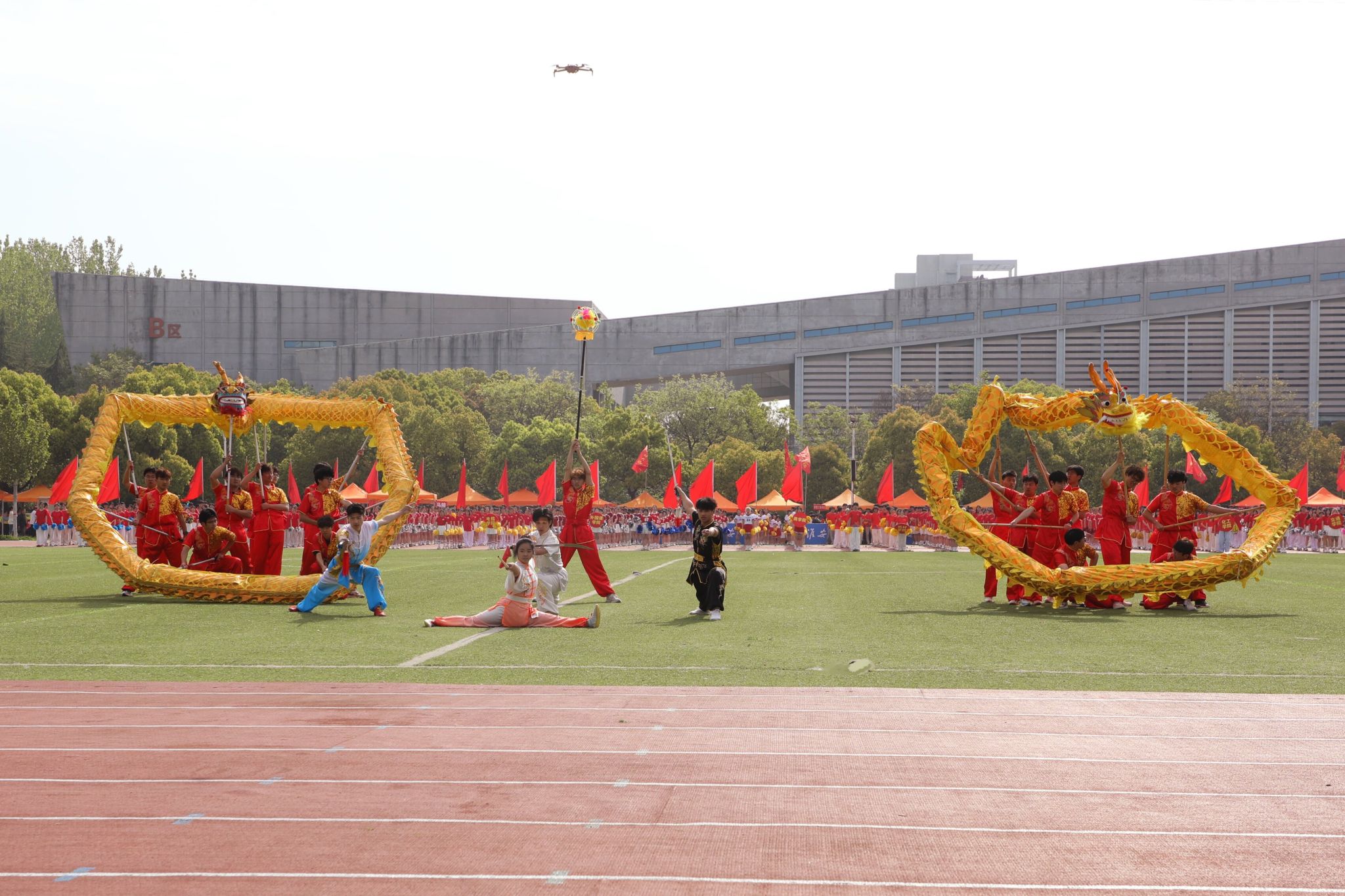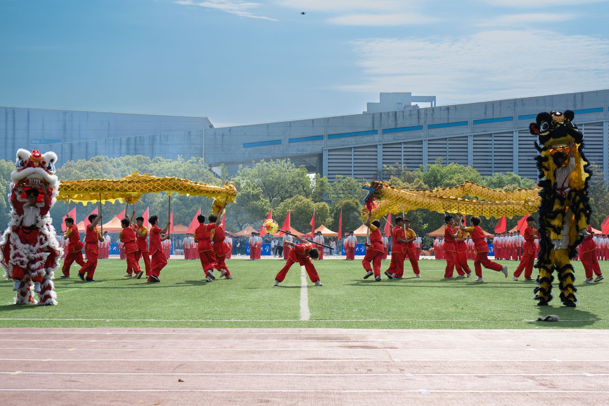 入场式后,龙狮献瑞·武韵风华、跃马逐光等节目依次上场表演,现场表演既有传统体育的恢宏气势,又有现代舞蹈的活泼灵动,将体育精神与艺术魅力有机融合、相得益彰,引来观众阵阵掌声,将现场氛围推向高潮。