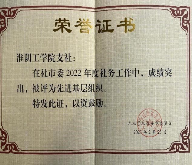 近日,九三学社淮安市委召开2022年度总结表彰大会。范更生主委代表九三学社淮安市委作2022年度工作报告,会议部署了2023年工作,并表彰社市委先进集体和先进个人。我校九三学社支社获评先进基层组织,张璟、程丽林两人获评优秀社员,刘海健荣获优秀参政议政工作者。