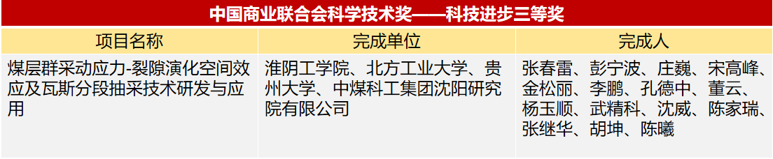 近日,“2024年度中国商业联合会科学技术奖”评审结果公布。我校作为第一单位,建筑工程学院教师张春雷作为第一完成人,彭宁波、董云、杨玉顺、武精科、沈威、陈家瑞、张继华、胡坤、陈曦参与的“煤层群采动应力——裂隙演化空间效应及瓦斯分段抽采技术研发与应用”项目荣获科技进步奖三等奖。