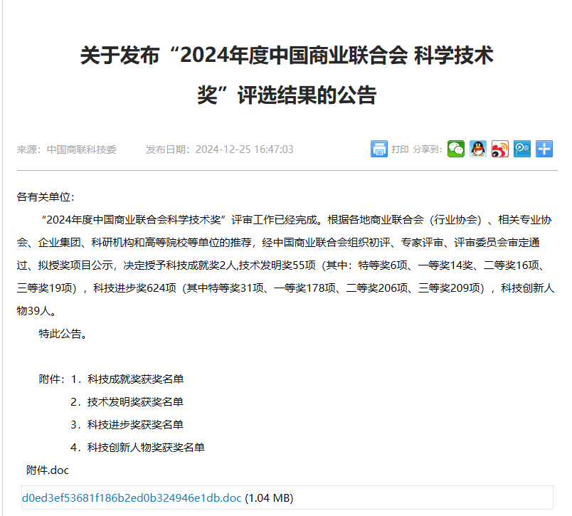 中国商业联合会科学技术奖是经科技部、国家科学技术奖励工作办公室批准设立的权威奖项,旨在奖励在全国商业行业科学研究、技术创新、成果推广、高新技术产业化中做出突出贡献的个人和组织,对作出特别重大贡献的,可以授予特等奖。中国商业联合会作为国家科学技术奖的推荐单位,将从获得技术发明奖、科技进步奖特等奖的项目中,择优推荐国家科学技术奖评审。2024年度,中国商业联合会科学技术奖共评出科技成就奖2人,技术发明奖55项(其中特等奖6项、一等奖14项、二等奖16项、三等奖19项),科技进步奖624项(其中特等奖31项、一等奖178项、二等奖206项、三等奖209项),科技创新人物39人。