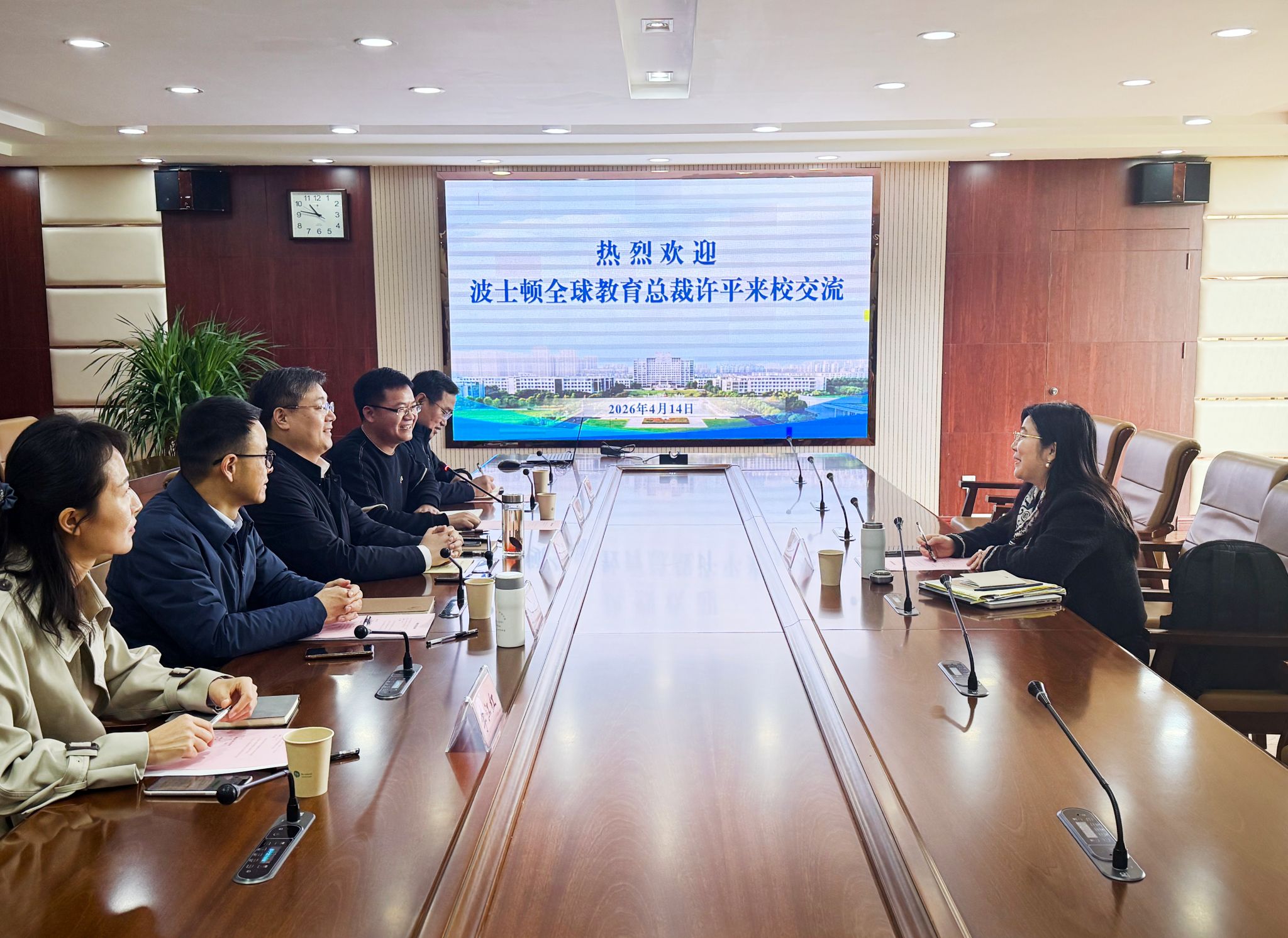 4月14日上午,美国波士顿全球教育总裁许平来校访问交流。校党委常委、副校长张灏出席交流会并致辞,国际处处长洪坤主持会议。