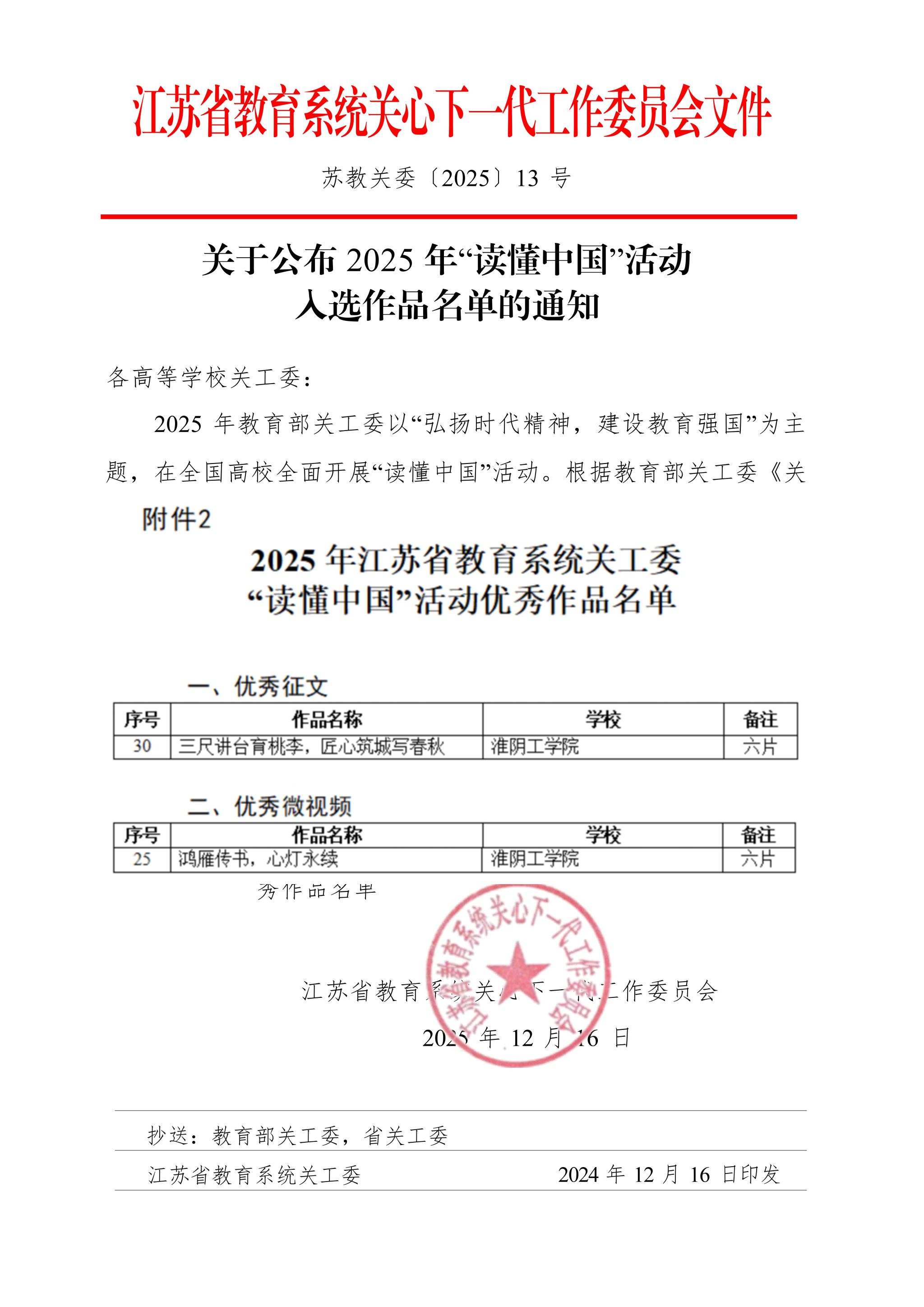 近日,江苏省教育系统关工委2025年“读懂中国”活动获奖名单正式公布,我校从近百件参赛作品中择优推荐的两件作品均获表彰,充分展现了淮工学子的青春风采与思想深度。
