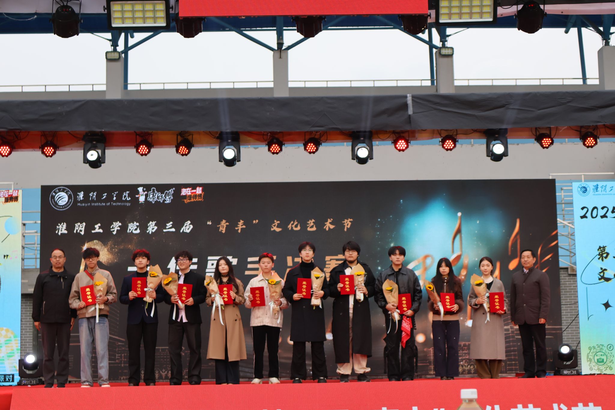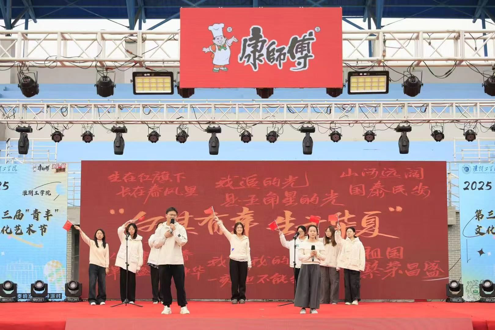 为全面学习贯彻党的二十大和党的二十届二中、三中、四中全会精神,深入落实习近平文化思想,充分发挥校园文化“以美育人、以文化人”的浸润作用,激励青年为推进中国式现代化挺膺担当,学校于2025年10月25日举办第三届“青丰”文化艺术节。本活动包含社团巡礼节、十佳歌手决赛、草坪音乐节三大环节,融入淮安红色文化元素与周恩来精神风范,为全校师生打造了一场兼具思想性与艺术性的文化活动。校党委副书记秦家沛,校党委常委、党委宣传部部长曹苏群,校党委学生工作部、党委研究生工作部部长何敬业,校关工委秘书长王启松,国际教育学院院长刘玉君出席开幕式。