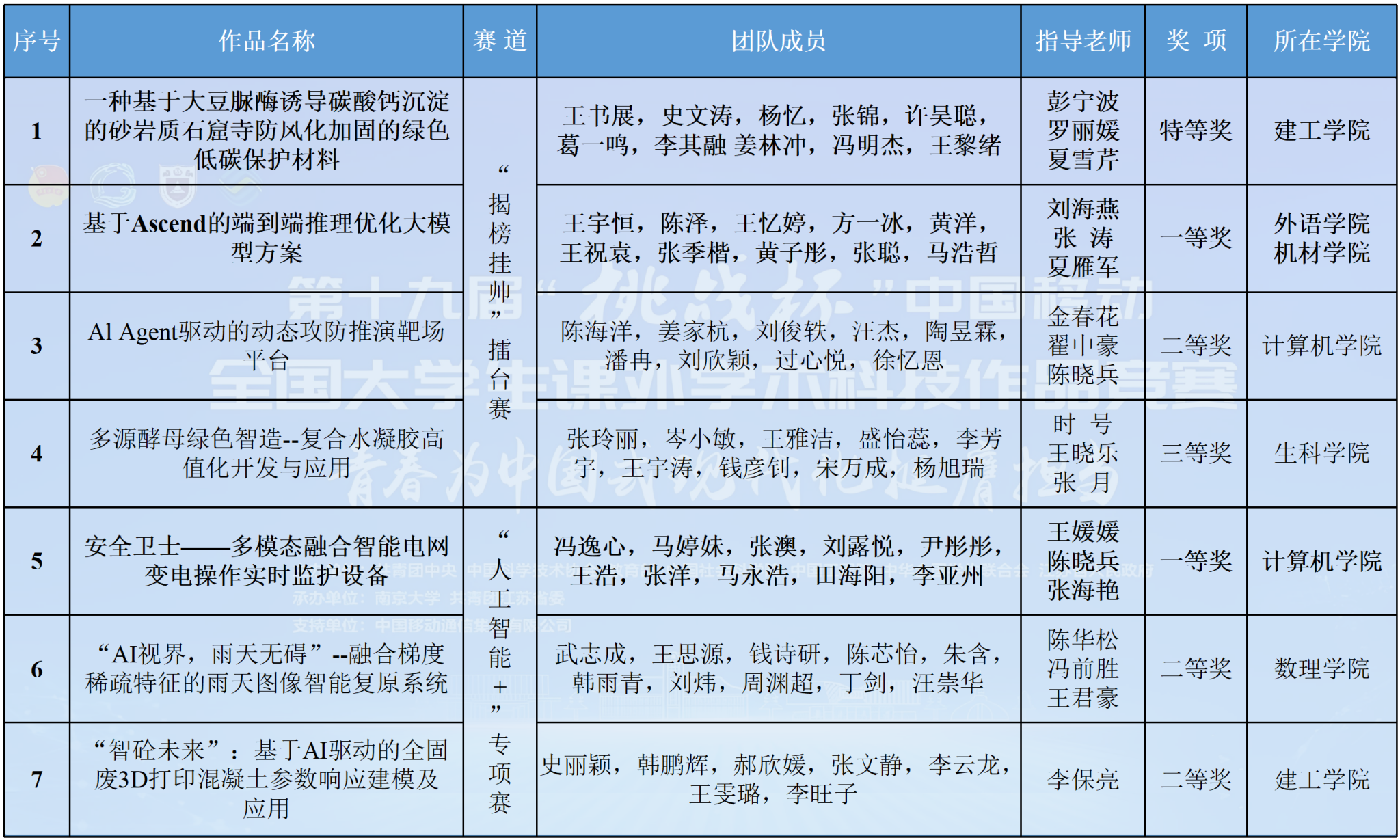 11月3日,由共青团中央、中国科协、教育部、中国社科院、中国工程院、全国学联和江苏省人民政府联合主办的第十九届“挑战杯”中国移动全国大学生课外学术科技作品竞赛系列赛事(主体赛、“人工智能+”专项赛、“揭榜挂帅”擂台赛)在江苏南京圆满落幕。我校在全国决赛的激烈角逐中奋勇争先,一举斩获7项国家级奖项,包括全国特等奖1项、一等奖2项、二等奖3项、三等奖1项,不仅刷新了我校在该赛事中的历史最好成绩,更首次实现单届赛事获奖等级全覆盖、获奖数量再创新高,并连续三年摘得“挑战杯”竞赛最高奖项荣誉,书写了淮工学子矢志创新、勇攀高峰的崭新篇章!