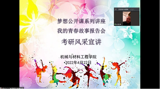 4月21日-22日晚7:00,机械与材料工程学院在腾讯会议开展梦想公开课系列讲座“我的青春故事报告会”,暨考研风采宣讲,王奕羡、王啸海、贺玉洁、谯兴龙、王小伟、徐子晴六位同学交流考研经验。学院关工委副主任徐亚洲、学工办主任郁大同、团委副书记郭巧会参加报告会,学生涂畅、臧潇晴为主持人,大一至大三共计两百余名同学参加。