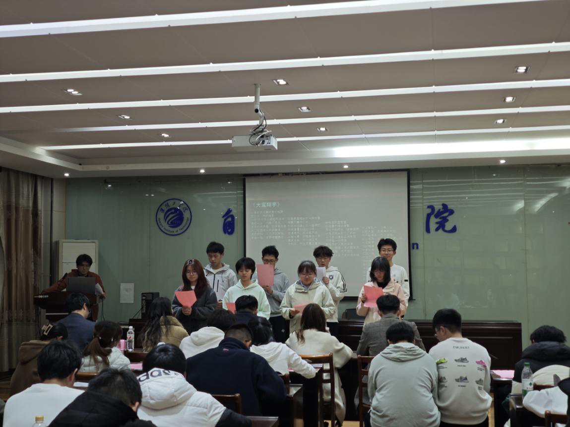 班训阐释与诗歌朗诵环节将活动推向高潮。各班配合悠扬或激昂的背景音乐,用标准流利的发音、饱含深情的语调,逐字逐句传递班训的力量与诗歌的温度。有的班级以“立志、实干、兼容”为班训,将专业学习感悟融入朗诵,表达脚踏实地、践行恩来精神中求真务实品格的坚定决心;有的班级以青春为笔,书写“传承总理精神,践行测控使命”的豪情,用铿锵有力的节奏展现大一新生传承伟人志向、勇担时代重任的精神风貌;还有的班级结合校园生活与专业前景,凝练出“崛起为志,翔宇为范,崇德尚行,笃学精业”的班训,将对集体的热爱、对未来的憧憬融入诗句,真挚的情感打动了在场评委与观众。