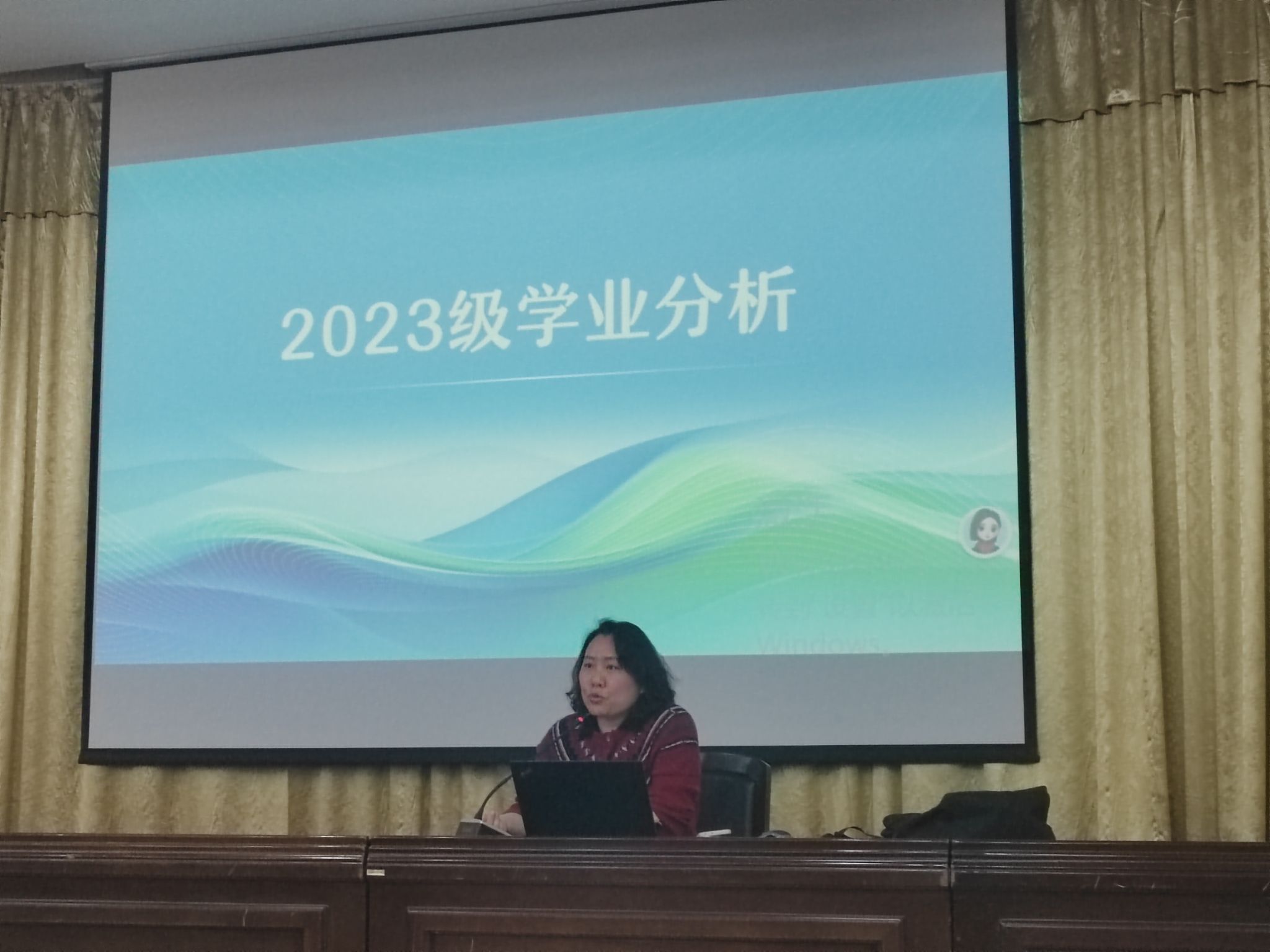 大会伊始,王蓉蓉主任围绕本学期重点工作、毕业要求以及上学期学业学情,展开全面细致的讲解。在学期工作部署环节,她着重明确了学业帮扶、学风建设、安全管理三大核心任务,筑牢学生学习生活与成长发展的基础。针对2023级学生最为关注的毕业要求,王主任紧扣专业人才培养目标,逐条解读毕业学分标准、考核要求,让全体同学清晰掌握毕业核心条件,做到心中有数、目标明确。在学业分析环节,她全面复盘上学期年级整体学业情况,深入剖析现存问题与成因,结合实际提出针对性改进建议,鼓励同学们正视差距、互帮互助,主动依托学院各类学习资源补齐短板,养成自律高效的学习习惯,携手营造勤学善思、争优创先的优良学风。