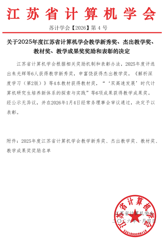 近日,江苏省计算机学会发布了2025年度江苏省计算机学会教学成果奖评选结果,计算机与软件工程学院陈晓兵教学团队申报的“面向领域分层分类多维融通——应用型高校软件人才培养模式改革与实践”获得江苏省计算机学会教学成果一等奖。该模式面向一般应用软件、行业应用软件、特需工具软件等领域,确立“夯实基础、强化行业、拔尖特需”的人才培养目标,建立“双轨”特色课程体系,实施分层分类培养,搭建创新实践平台,取得了显著的专业建设和人才培养成效。