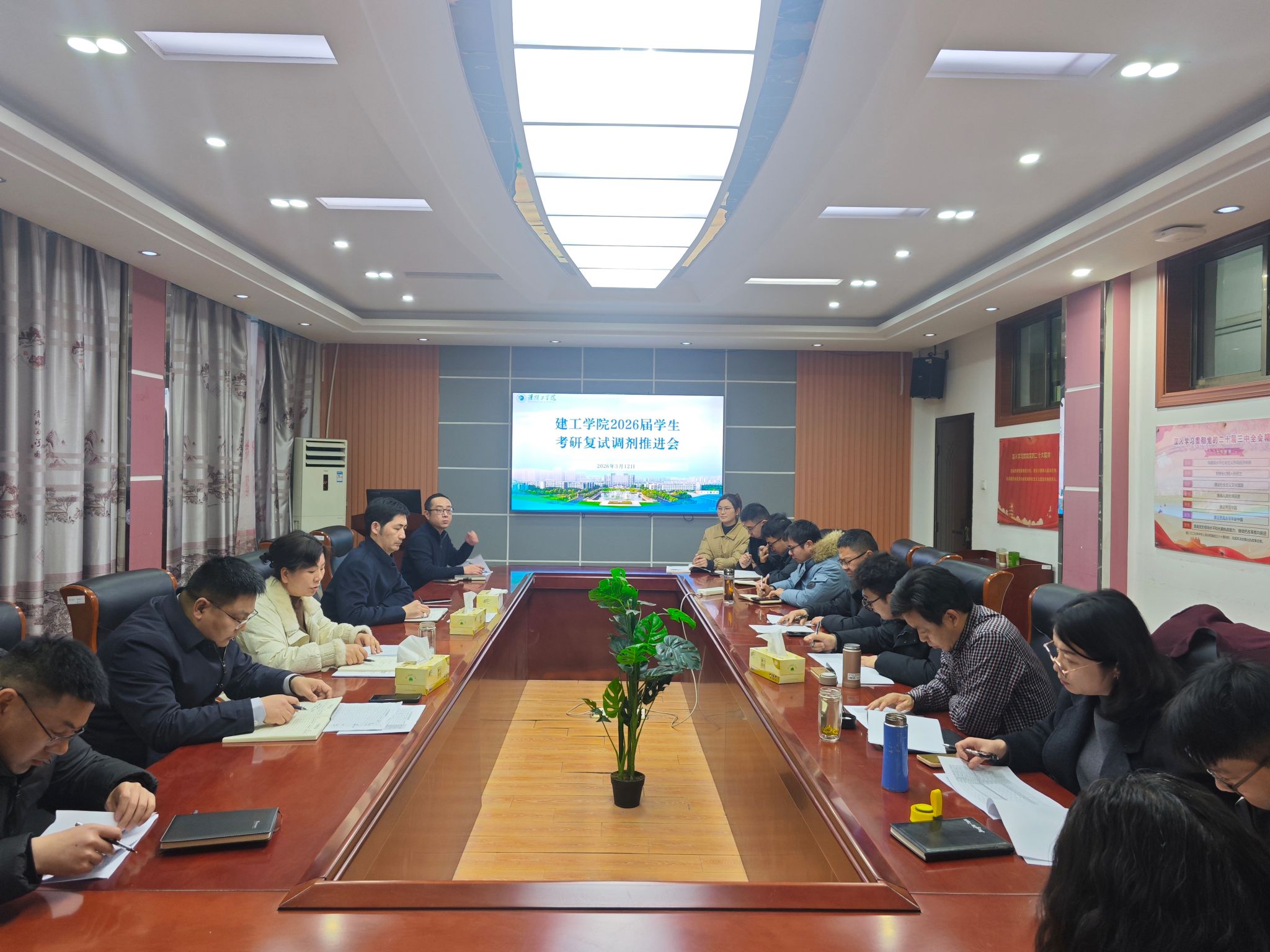 3月12日晚,建工学院在3316会议室召开了2026届学生考研复试调剂工作专题会议。学院领导班子成员、各系部主任和书记、毕业班班主任及全体辅导员参加会议。
