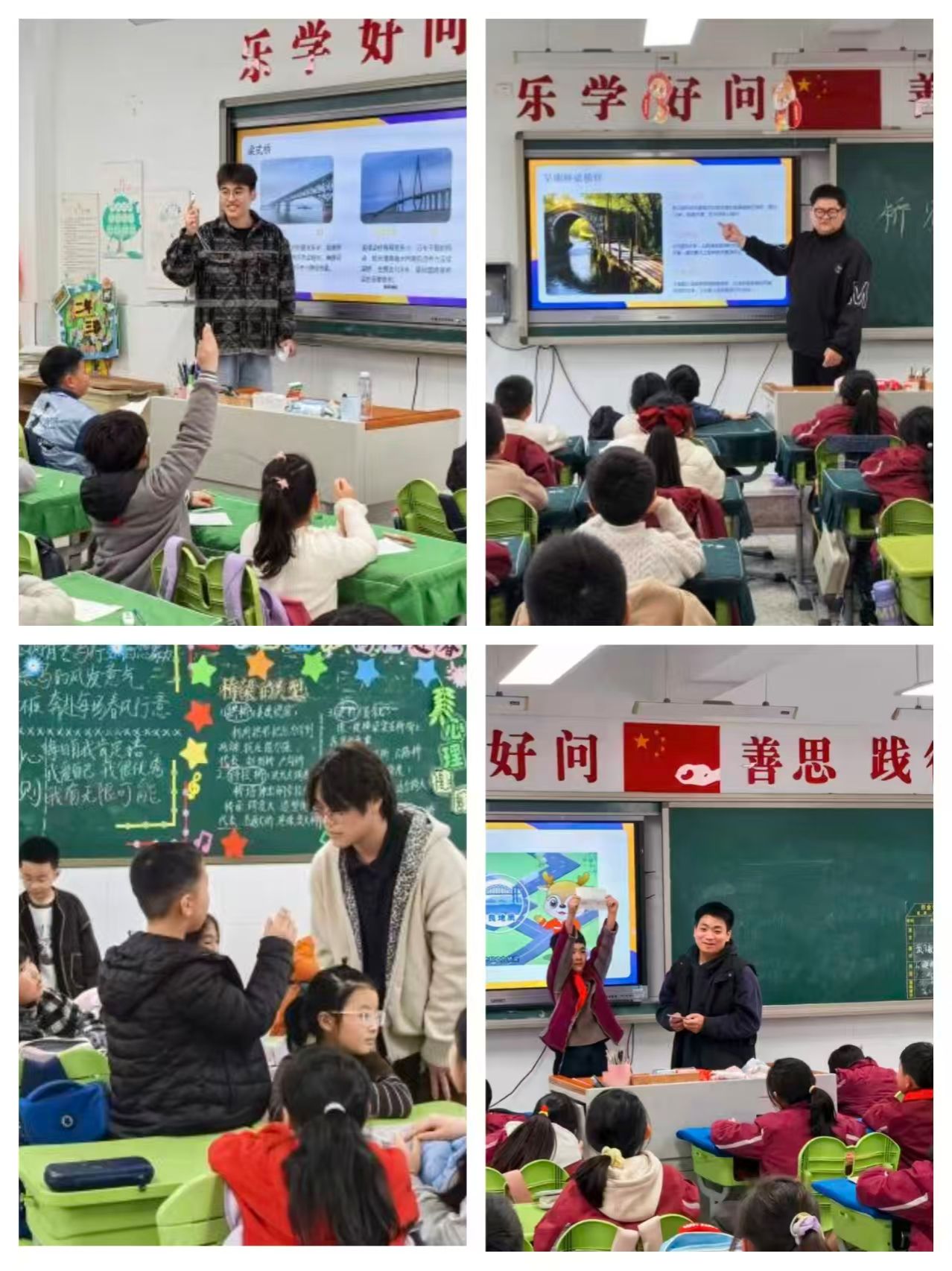 “同学们,你们知道世界上最古老的石拱桥在哪里吗?“活动现场,实践队成员化身“桥梁讲解员”,通过精美的PPT演示,带领孩子们穿越时空,从云南怒江的藤索桥、黄河上的浮桥,到浙江绍兴的石梁桥,再到今天的港珠澳大桥,生动讲述了桥梁从古至今的演变历程。