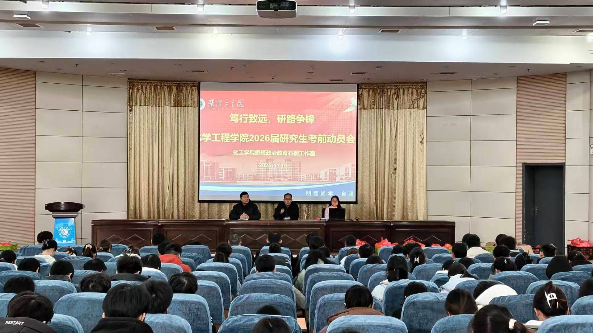 逐梦之路,从不是孤身前行。为鼓舞备战考研的学子们坚定信念、全力冲刺,11月19日10点,化学工程学院在图书馆报告厅精心举办了一场温情满满的考研动员活动。参加本次活动的有化学工程学院党委书记张常新,党委副书记金娅琳,学生工作办公室主任袁野和全体2022级考研学生。