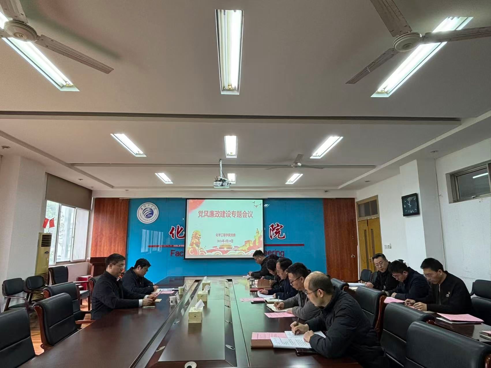 2026年4月10日上午,化工学院党委在26211会议室召开党风廉政建设工作专题会议,学院全体领导班子成员、各党支部书记参加会议。会议由学院党委书记张常新主持,校党委常委、副校长张灏,校党委巡察办常务副主任石磊到会指导。