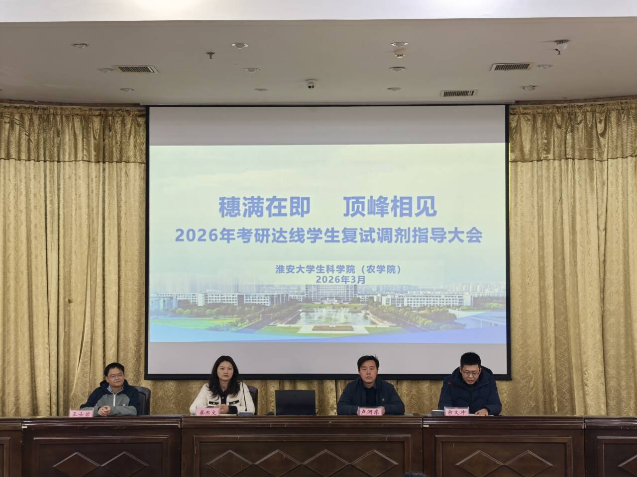 为进一步提升学生考研复试竞争力,切实助力学子顺利上岸,3月19日下午,生科学院(农学院)在图书馆报告厅召开考研复试及调剂指导大会。学院党委副书记、副院长蔡熙文,院长助理卢河东,王士岩博士,学工办主任余文冲,2026届辅导员及所有考研达国家线学生参会,会议由余文冲主持。