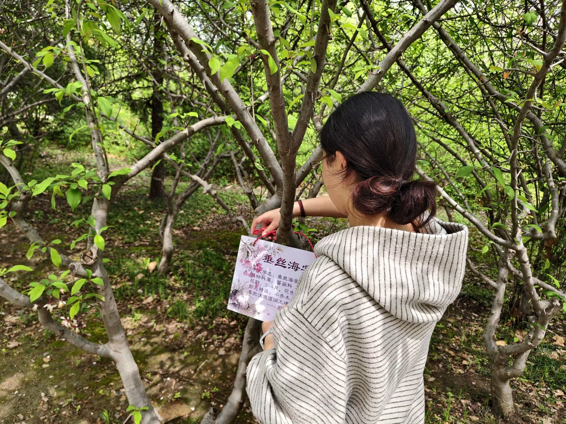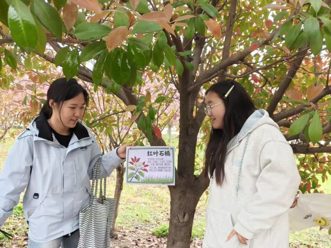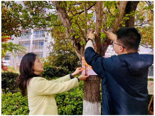 活动前期,园景系同学分组深入校园南北苑区域,运用专业知识对树木进行实地辨识与分类,确定香樟、樱花、银杏等20余种绿植,并结合植物科属、生长习性、生态价值等内容,精心设计制作环保科普介绍牌。挂牌现场,师生分工协作、默契配合,有序完成标牌悬挂,让绿植拥有了清晰易懂的“科普身份证”。