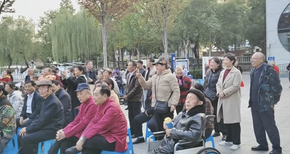演出现场热闹非凡,社区文艺团队献上了舞蹈、小品、歌剧等精彩纷呈的节目。演员们身着红绿相间的华美服饰,在红色舞台的映衬下翩然起舞,活力满满的表演赢得台下观众阵阵掌声。老年居民们或安坐于蓝色小凳上,或在家人陪伴下驻足观赏,脸上洋溢着幸福笑容,现场处处萦绕着温馨热烈的节日氛围。