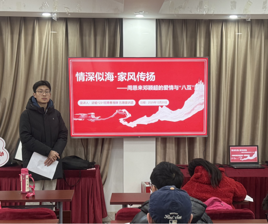 2025年12月20日,淮阴工学院交通工程学院运输1231班“青春淮畔·五德宣讲团”围绕“周恩来邓颖超的爱情与‘八互’原则”主题,开展了一场内容丰富、情感真挚的主题宣讲活动。宣讲团以伟人家风故事为切入点,引导同学们在革命爱情与家庭美德中感悟信仰力量,汲取精神滋养。