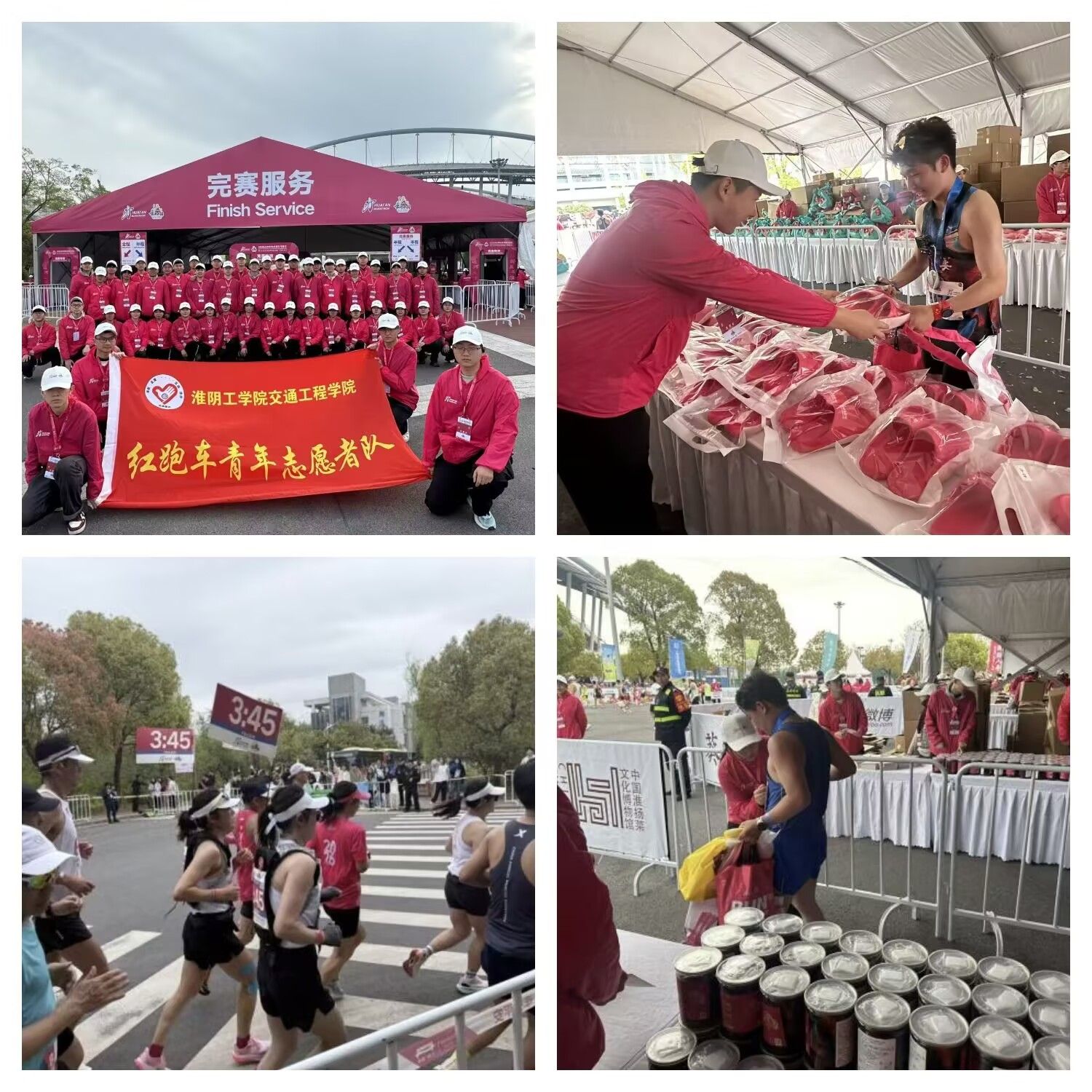 本次志愿服务分工明确、组织有序:49名校外志愿者担任终点物资发放组,负责完赛物资分发、选手引导等关键工作;20余名志愿者协助社区组成啦啦队,以鼓声与呐喊为选手加油鼓劲;校内志愿者手持助威道具,悬挂 “相约淮工,马到成功” 横幅,在赛道沿线热情呐喊。赛前,全体志愿者参加专项培训与岗位演练,以充分准备投入服务。