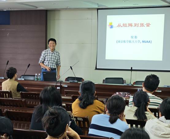 报告伊始,倪勤教授从张量的基本理论出发,系统讲解了张量特征值、张量分解方法、相关算法及其实际应用,生动展现了张量在科学研究中的广泛应用与独特价值。他指出,人工智能时代既带来挑战也蕴含机遇,鼓励在场师生积极把握技术浪潮,将AI工具融入学习与科研实践,不断提升创新能力。