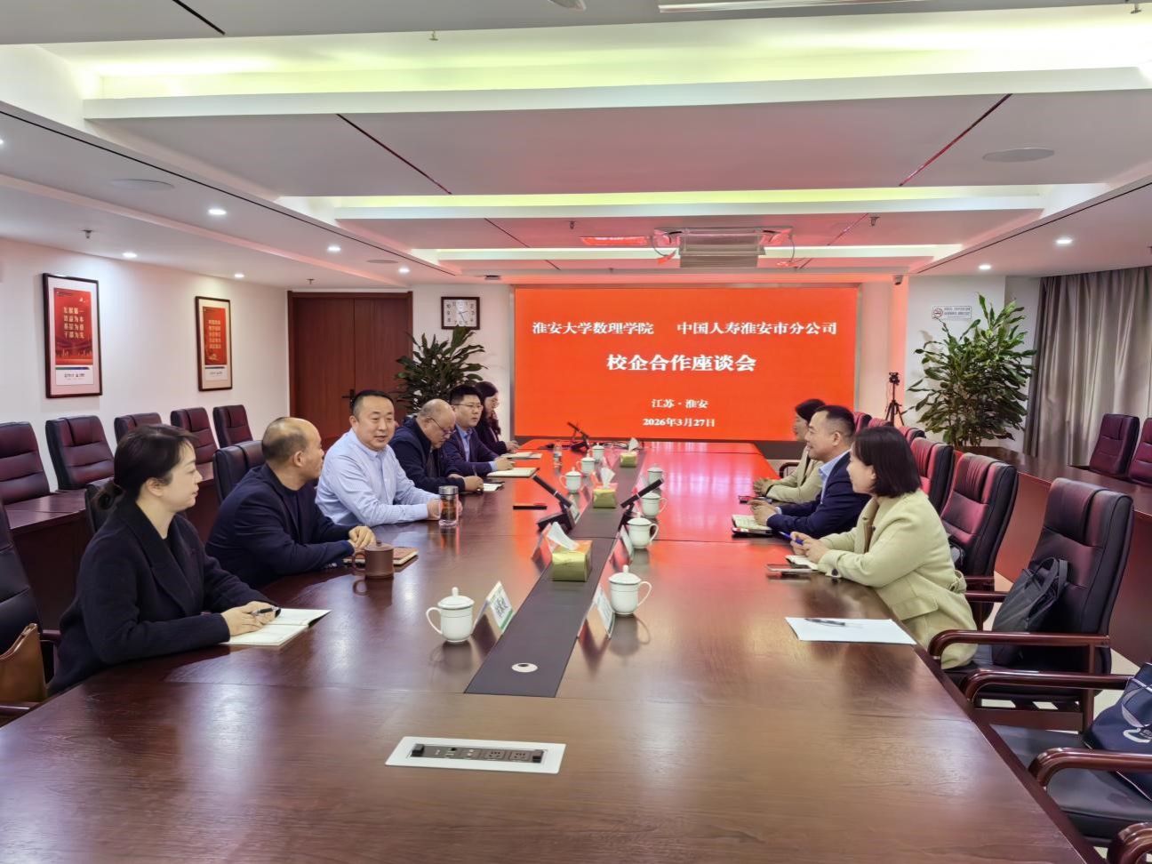 为推进“高校党组织对接产业链党组织”专项行动、扎实开展党建联建,推进党建与业务“一融双高”,结合“访企拓岗促就业”专项行动部署,3月27日下午,淮安大学数理学院党委联合中国人寿淮安市分公司举办校企党建共建暨访企拓岗座谈会。数理学院党委书记杨向阳、副书记王晓惠、副院长范媛媛、中国人寿淮安市分公司刘辉副总经理及相关代表参会。