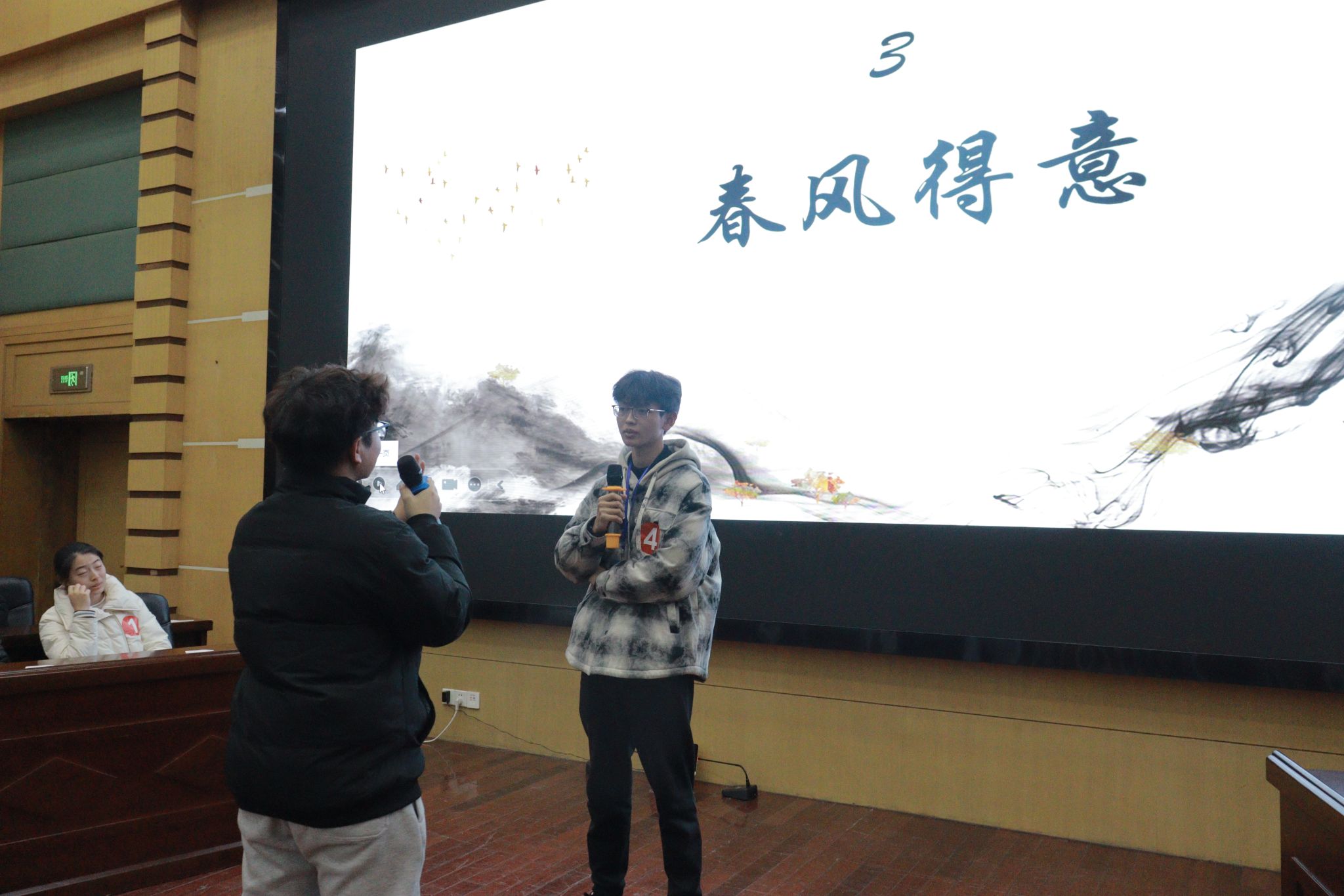 题目形式多样,有九宫格的乱花眯眼,有线索题的拨云见日,有视频题的诗画复现。难度层层递进,从“‘唐宋八大家’中属于唐代的两位诗人是谁”到“‘青旗沽酒趁梨花’”描写的是哪个城市”的深度题,选手们时而屏息凝神思考,时而果断按下抢答键,精彩的应答不断刷新现场热度。最后一题的视频题更是给大家带来了美的体验,人文学子和桂木同学用丹青妙笔完美呈现了“遥望洞庭山水翠,白银盘里一青螺”的洞庭风光,让大家在紧张的比赛氛围之中感受到诗词的意境之美。