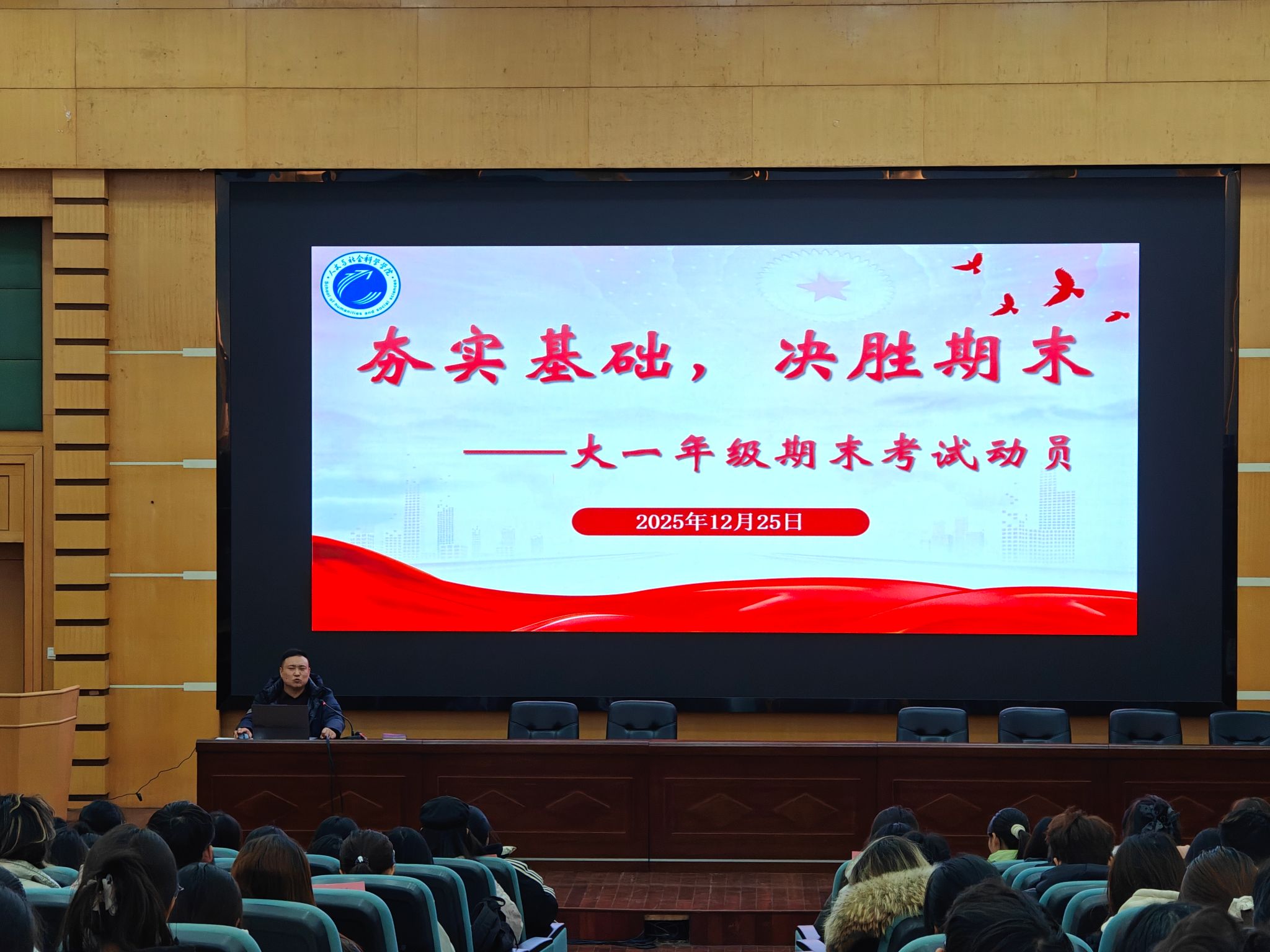 为帮助25级新生明确期末备考方向,掌握科学复习方法,凝聚奋斗力量,12月25日我院25级期末备考动员大会在尚学楼报告厅隆重召开。学院学工办主任、25级辅导员时正杰担任主讲人,25级全体新生参会。