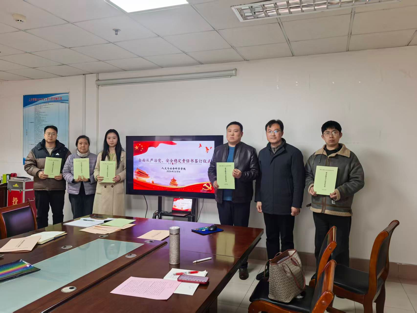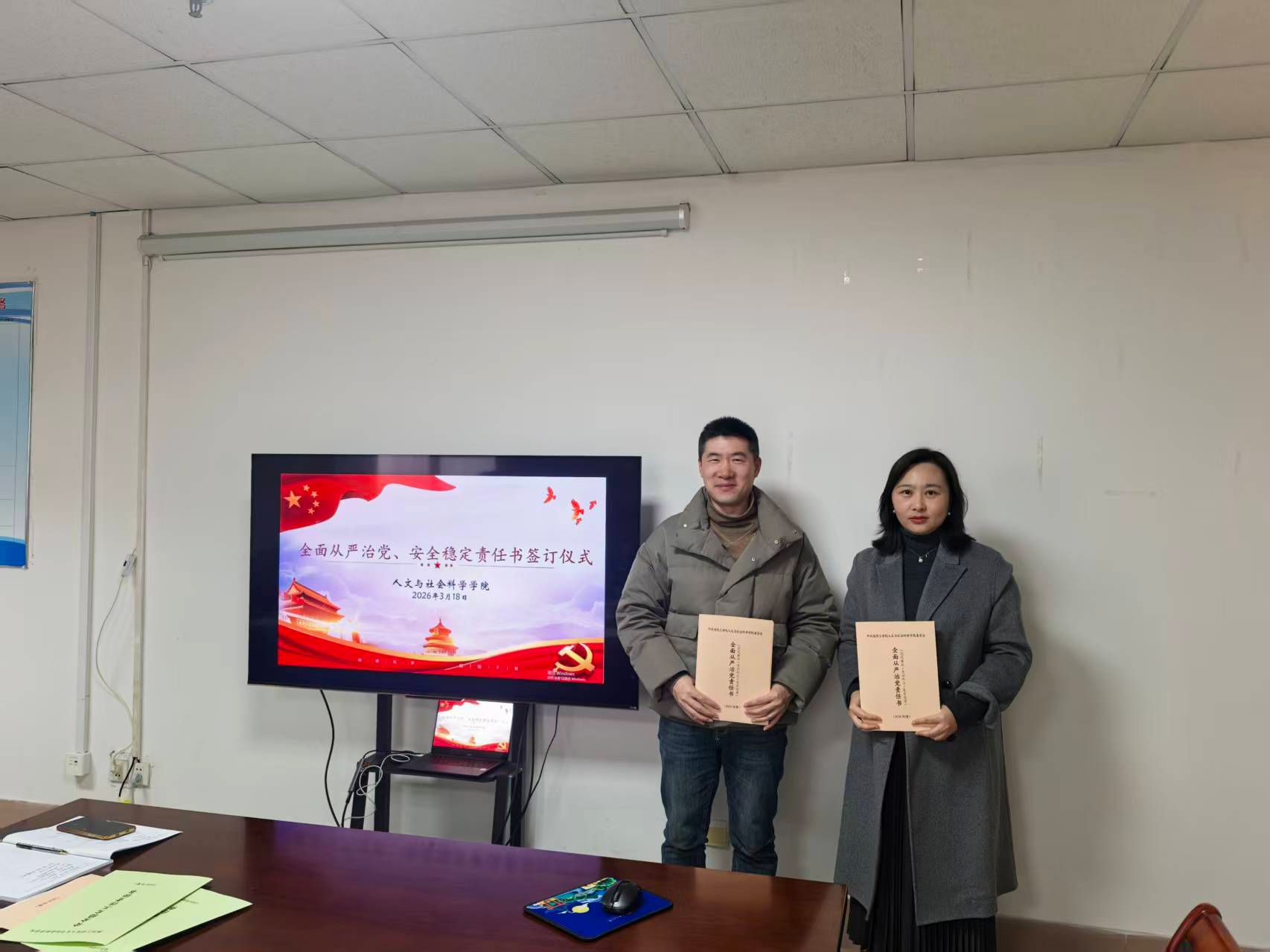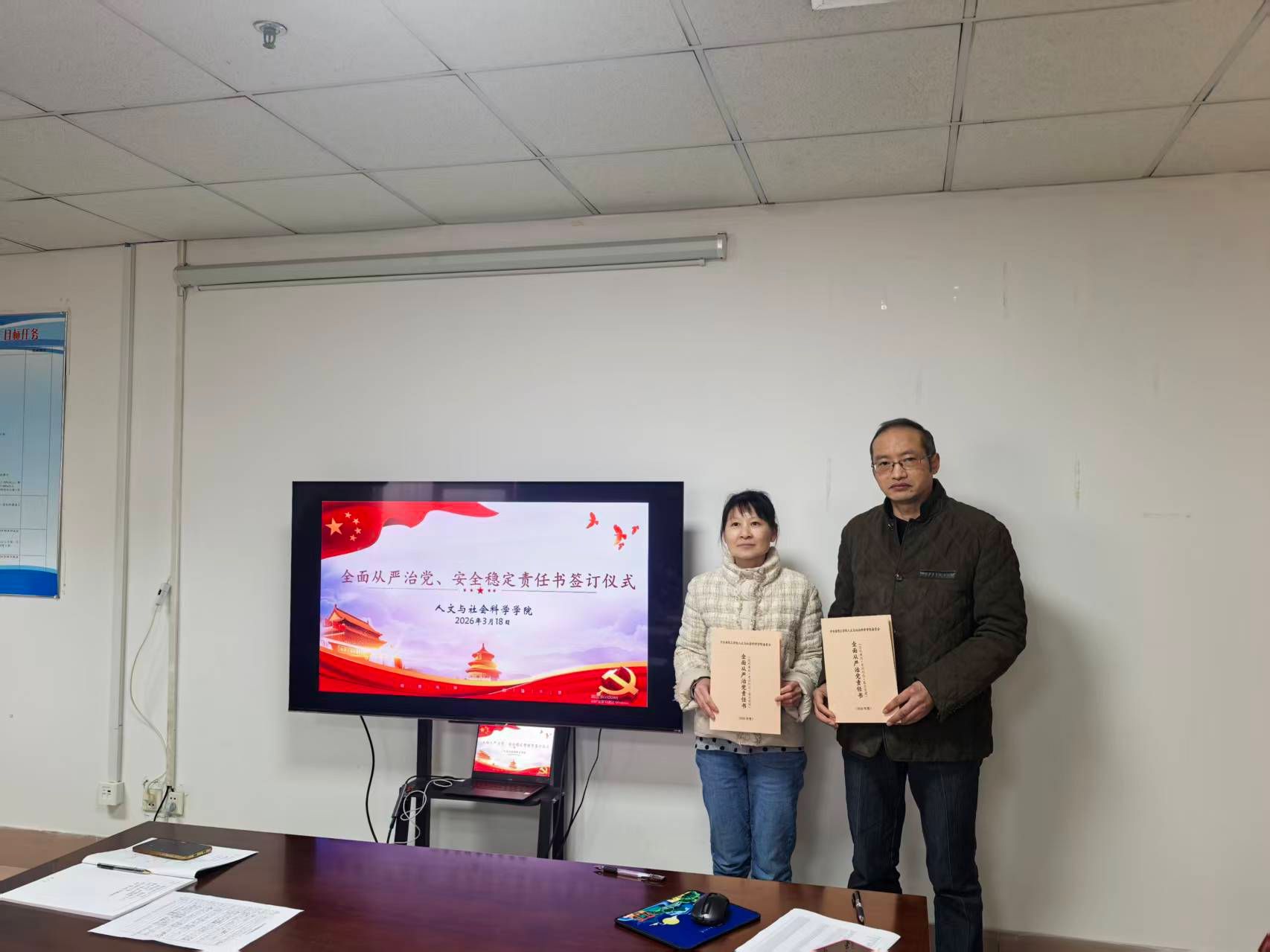 在与会人员的共同见证下,会议举行了责任书签订仪式。学院党政一把手与班子成员逐一签订了《人文与社会科学学院2026年度全面从严治党责任书》、《人文与社会科学学院2026年度安全稳定工作责任书》,明确了班子成员在分管领域内管党治党、党风廉政建设的领导责任,细化了履职清单和考核标准。随后,学院领导干部分别与所分管岗位负责人签订了《人文与社会科学学院2026年度安全稳定工作责任书》和《人文与社会科学学院2026年度全面从严治党责任书》,将责任层层分解、精准传导,落实到岗、具体到人,形成了“党委统筹、班子引领、全员参与、层层落实”的责任体系。