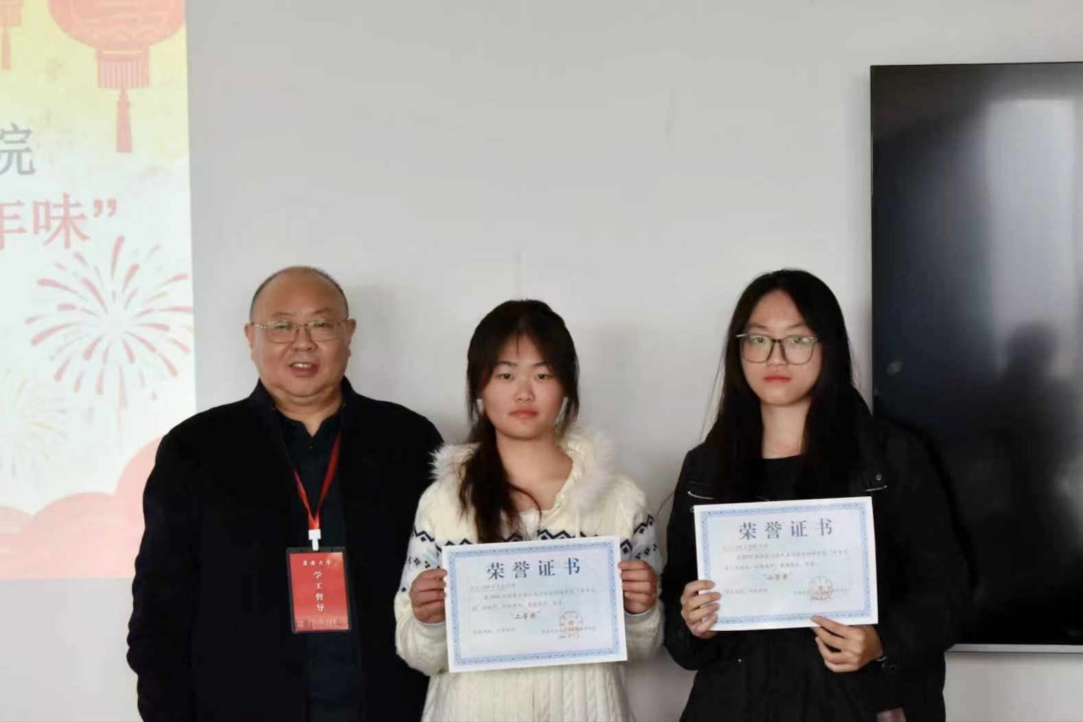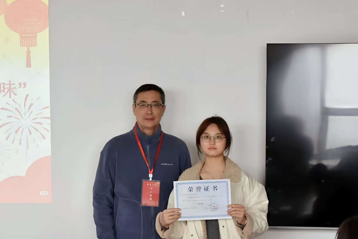 随后,获奖选手依次上台对自己的文章的灵感以及构思进行介绍。他们以细腻生动的笔触,勾勒出家乡过年时的热闹景象、传统习俗与舌尖美味,令在场同学仿佛沉浸在浓郁的年味里,深深领略到家乡独有的风情与魅力。交流结束后,管永刚、张乃军、周志国三位依次三等奖、二等奖、一等奖获奖同学颁发证书并合影留念。