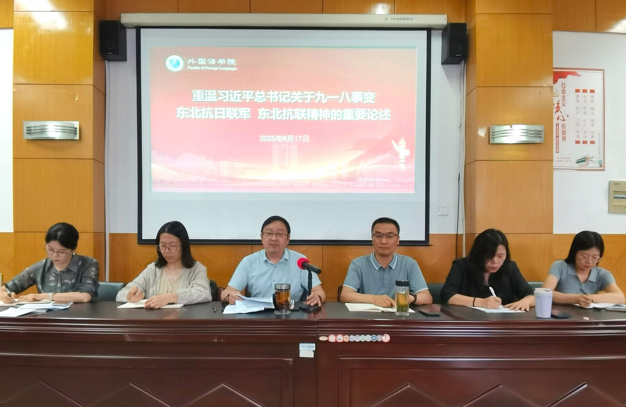 为深切缅怀革命先烈,传承红色基因,深刻领悟伟大抗战精神的时代价值,在“九一八”事变纪念日来临之际,9月17日下午,外国语学院召开全院大会,重温习近平总书记关于九一八事变、东北抗日联军、东北抗联精神的重要论述。本次专题学习会由院党委书记李炜主持。
