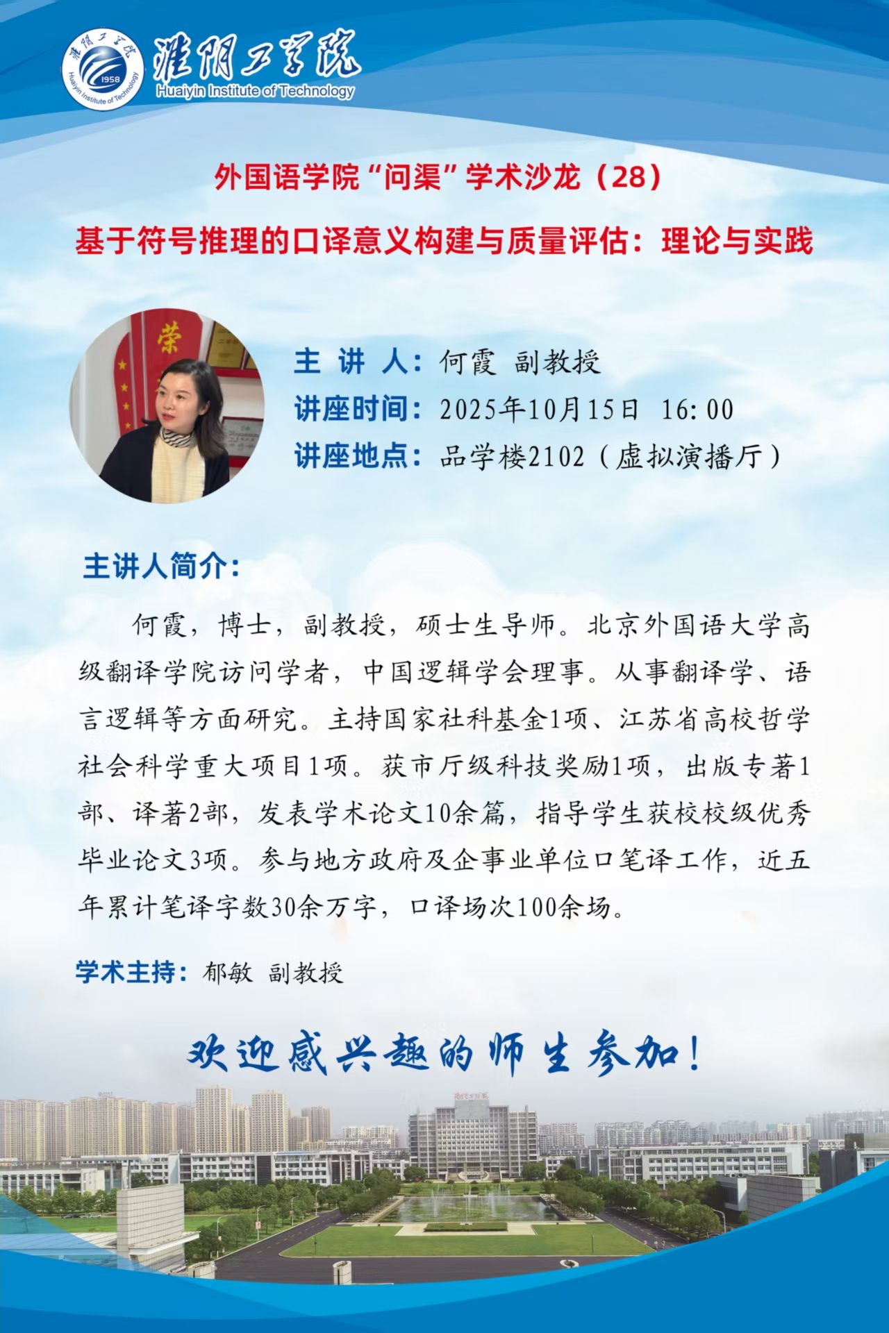 2025年10月15日下午16:00,外国语学院于品学楼2号楼2102(虚拟演播厅)举办第二十八期“问渠”学术沙龙活动。本次学术沙龙邀请外国语学院MTI教育中心主任何霞博士担任主讲人,副院长郁敏主持,外国语学院研究所成员教师、2025级MTI研究生参加。