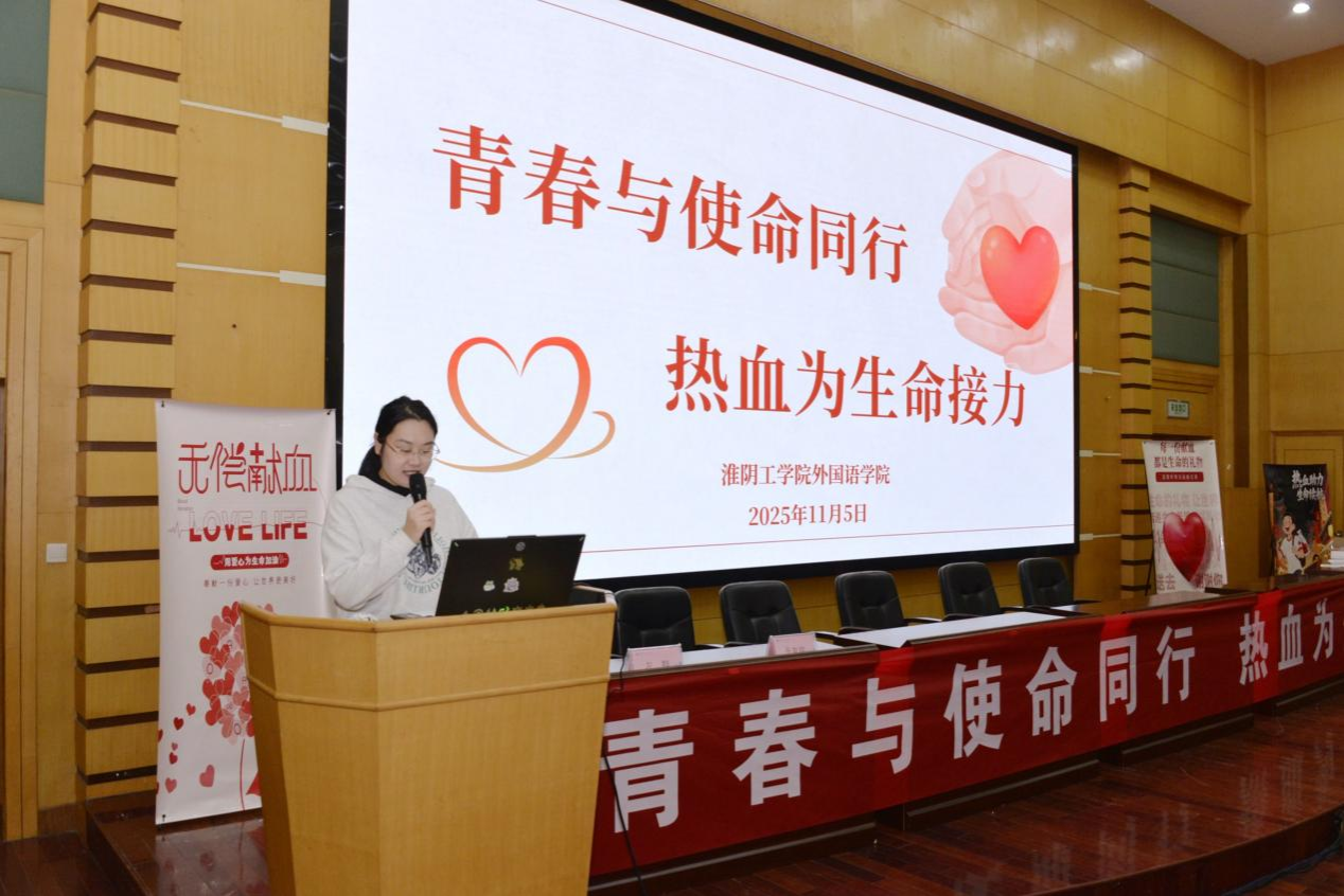 秋色浸染校园,爱心汇聚暖流。11月5日,淮阴工学院外国语学院邀请淮安市中心血站“热血先锋”宣讲团进校开展“青春与使命同行,热血为生命接力”无偿献血宣传活动,为淮工学子翻开了一本关于生命、爱与奉献的青春之书。