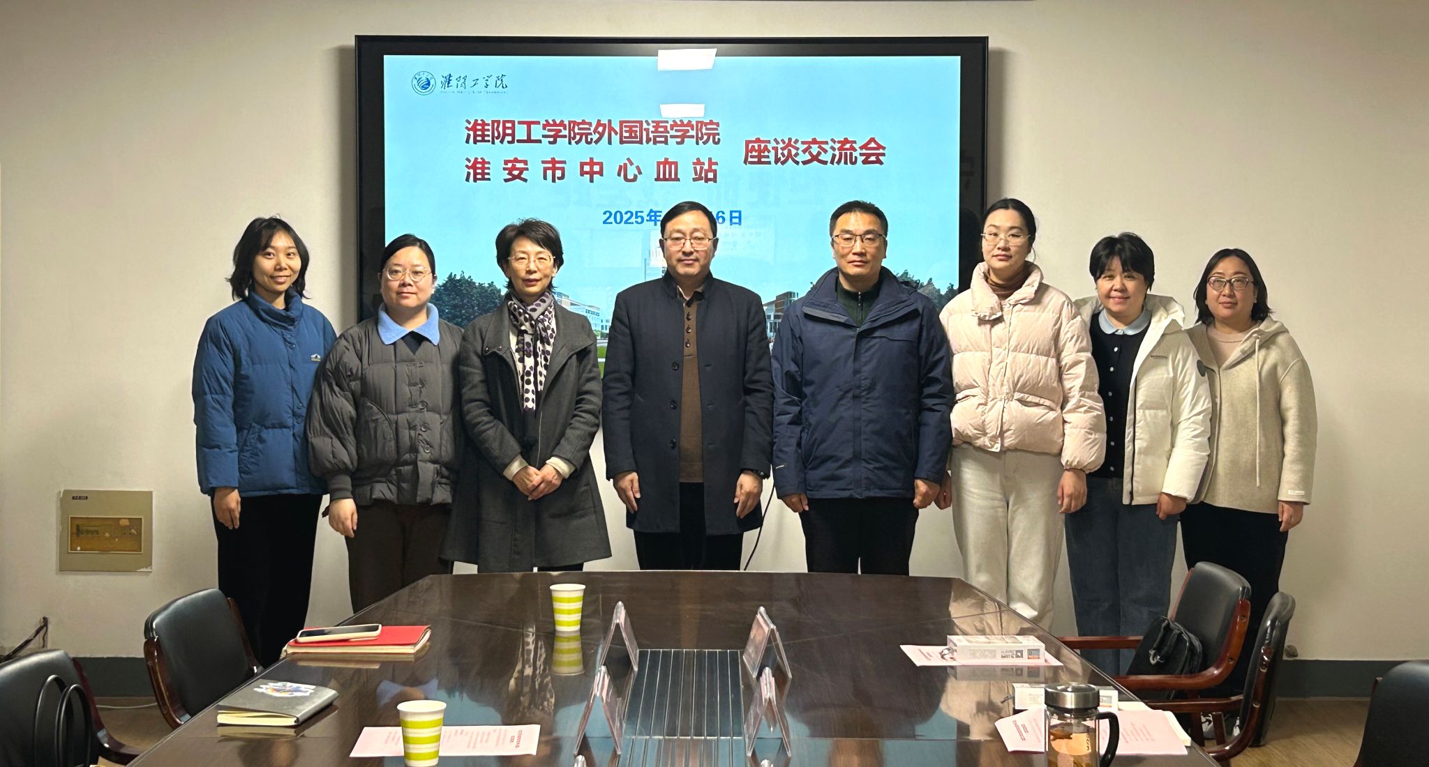 12月16日下午14:30,淮阴工学院外国语学院与淮安市中心血站在品学楼2301会议室召开座谈交流会。淮安市中心血站书记、站长谈庆,市卫健委安监处处长卞坤娟,市药具站副站长张羽佳,市中心血站办公室主任王永梅、信息科科长贾新燕出席会议。外国语学院党委书记李炜,院长胡庭树,党委副书记、副院长祖维,团委书记朱胜男,学生会主席团执行主席刘真好出席本次座谈会。