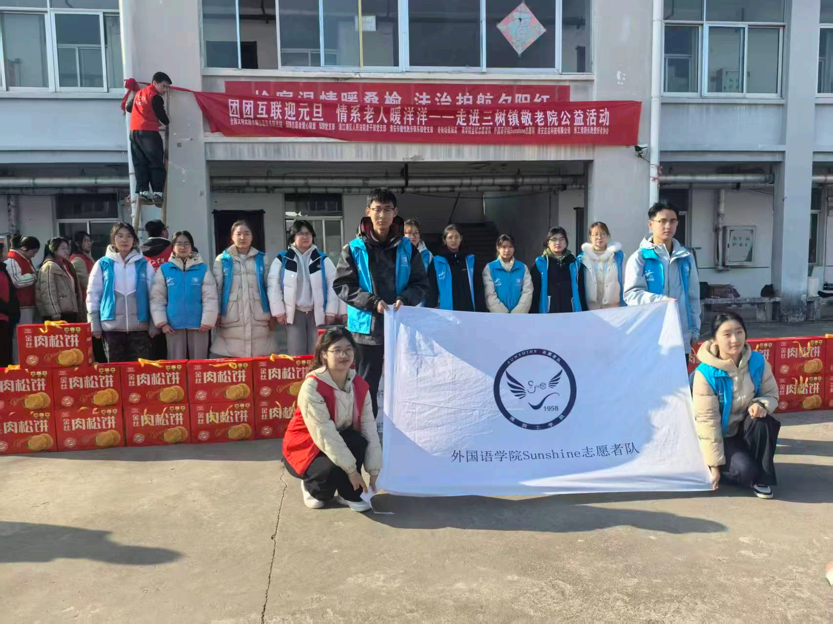 2025年12月28日,为弘扬“奉献、友爱、互助、进步”的志愿者精神,在元旦佳节即将来临之际,外国语学院Sunshine志愿队响应“520志愿者爱心联盟”的号召,前往三树镇敬老院开展了以“团团互联迎元旦,情系老人暖洋洋”为主题的慰问活动。
