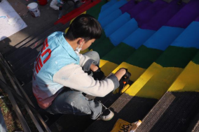笔触流转间,楼梯通道、台阶墙面等原本单调的区域焕然一新,每一抹色彩都传递奋进力量,使基地成为主题鲜明、富有感染力的“沉浸式创新打卡点”。