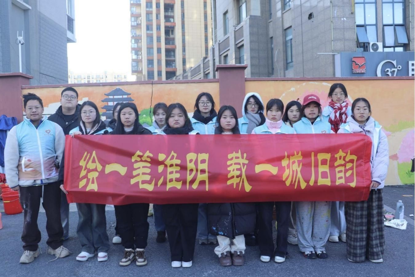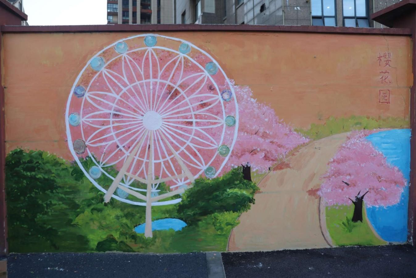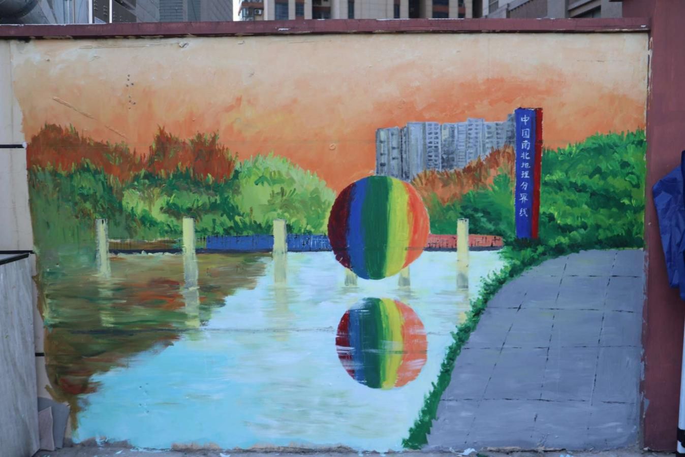此次活动让闲置墙面完成从 “灰暗角落” 到 兼具观赏性与教育意义的 “沉浸式打卡点”。南北分界线标志球在夕阳下色彩斑斓;用心晕染爱心塔的轮廓温暖醒目;樱花园的烂漫景致栩栩如生。三个画面巧妙融合,成为展现淮阴特色的“立体城市画卷”。