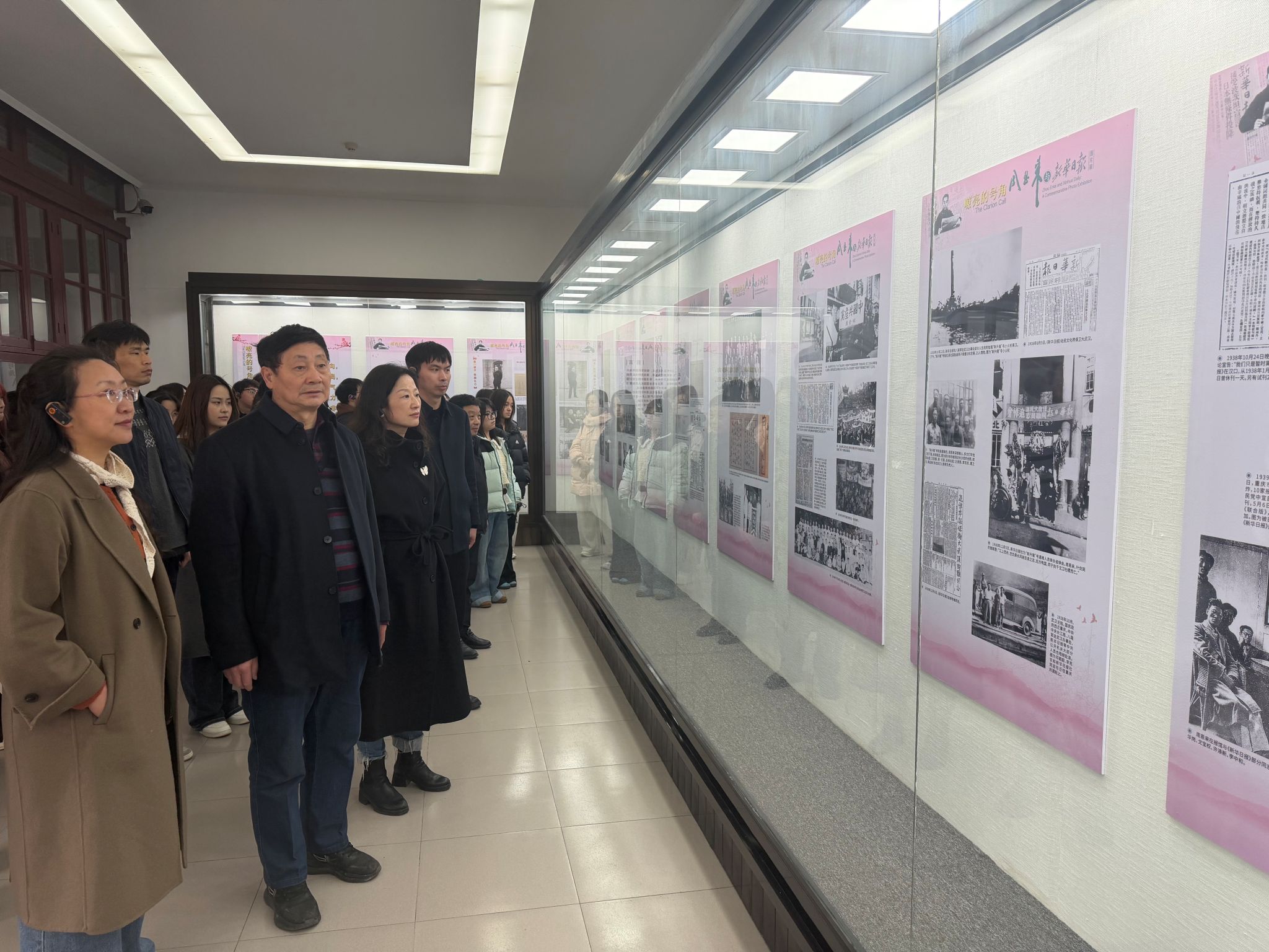 周恩来是《新华日报》的核心缔造者与领导者,在抗战时期的国统区,以这张报纸为阵地,领导了一场没有硝烟的舆论斗争,留下了诸多可歌可泣的故事。1938 年1月11日,《新华日报》在武汉正式创刊,这是中国共产党在国统区公开发行的第一张全国性报纸。创刊前两天,周恩来题词“坚持长期抗战 争取最后胜利”,为报纸确立了办报方针。周恩来始终强调《新华日报》要扎根人民、服务人民。1947年报社创刊9周年时,他题词“为人民喉舌,为人民向导,继续努力,坚持不屈”,深刻阐明了党报的根本宗旨。他还常指导记者深入群众,让报纸真正成为联系群众、动员抗战的桥梁。周恩来对《新华日报》的领导,始终贯穿着严谨务实、坚守使命的精神。从办报方针的制定,到每一次舆论斗争的指挥,他都亲力亲为、一丝不苟,这种精神也融入了《新华日报》的血脉,成为党报工作者的宝贵财富。活动中,师生们走进“文物映初心,号角传薪火——周恩来与《新华日报》图片展”,在珍贵历史图片与文献资料前驻足观看、认真聆听。大家循着伟人足迹,重温周恩来同志领导革命宣传工作、坚守初心使命的峥嵘岁月,深刻感悟老一辈无产阶级革命家的崇高精神与家国情怀。