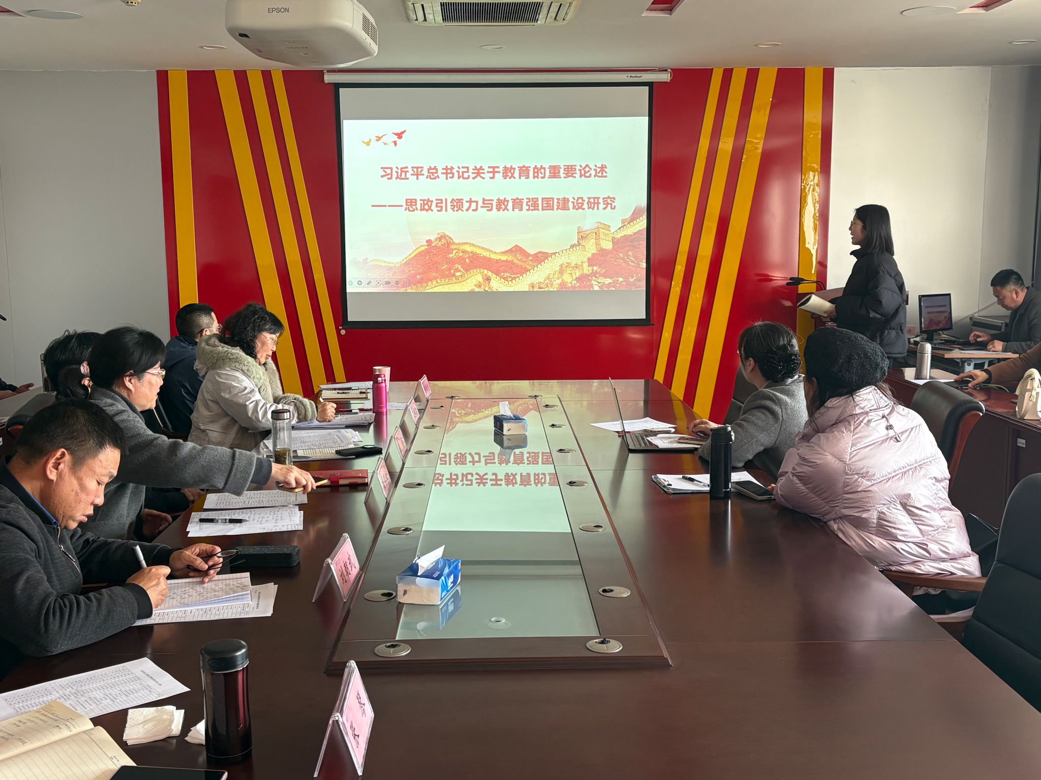汇报会研究主题覆盖面广、前沿性强,围绕马克思主义理论、习近平新时代中国特色社会主义思想、思想政治教育、中华民族共同体意识、国际政治等学科领域展开。仲昭慧、秦存强、刘莲香等教师分别就“马克思主义意识形态理论与实践”“习近平文化思想”“乡土文化”等主题汇报研究进展;徐岩、王红、孙丽娟聚焦文化传承与创新,深入探讨“第二个结合”与中华优秀传统文化的创造性转化与创新性发展;张悟枫、秦蕾、闫全、闫彩虹着力探索智能技术与思政教育融合,系统阐释AIGC赋能思政育人体系的构建路径;张琳琳、汤洁、王红艳围绕大中小学思政教育一体化,从课程建设、教学方法到实践机制提出系统方案;张春楼、孙林、王国锋、英荣发、李扬、王潇敬分别从中西马会通、数字党建、共同富裕、资本逻辑、新质生产力、高水平对外开放等视角展开理论探索与实证研究;解军、庄祺、夏振鹏、崔志淼、姚昀晖、李环宇等教师,分别围绕地方红色文化、新时代影视创作、中华民族共同体意识、教育强国建设、中美关系、青年思政话语创新等议题汇报了研究进展与创新思路。