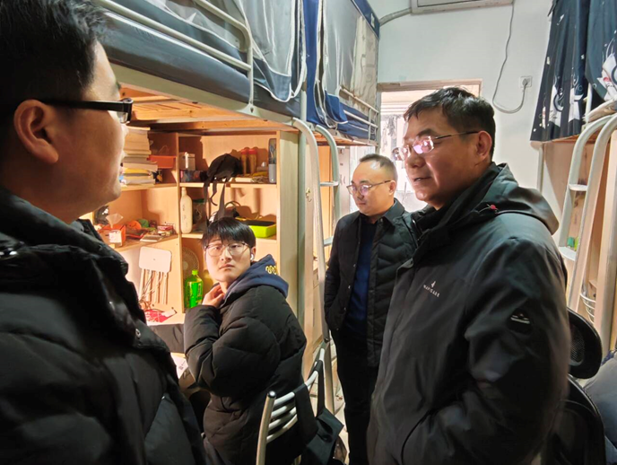 蒋青松在检查中与同学们亲切交谈,详细询问了期末考试复习情况和考研初试情况,鼓励大家科学备考、劳逸结合,以积极心态迎接考试。同时要求同学们严格遵守考试纪律,诚信应考,同时注意防寒保暖,保持良好作息,以饱满的精神状态投入到学习生活中。