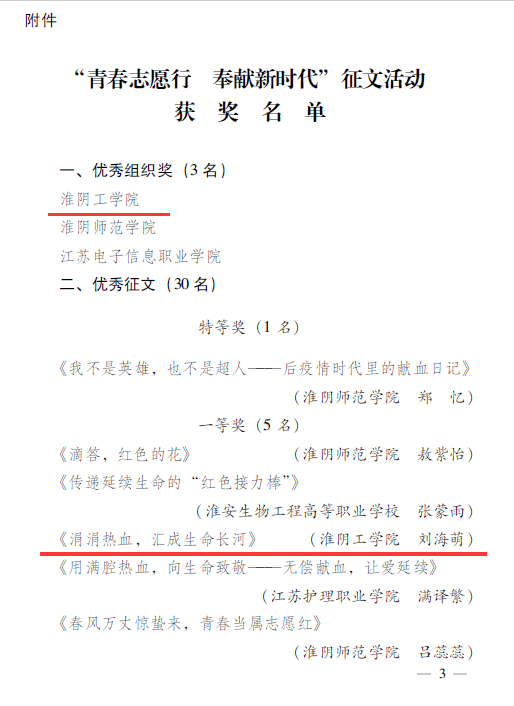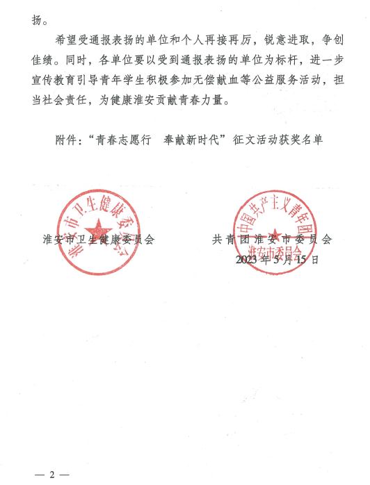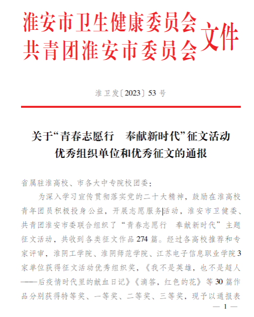 近日,我校在淮安市卫健委、共青团淮安市委联合举办的“青春志愿行 奉献新时代”主题征文活动中,荣获优秀组织奖。学生作品获一等奖1篇,二等奖4篇,三等奖2篇。