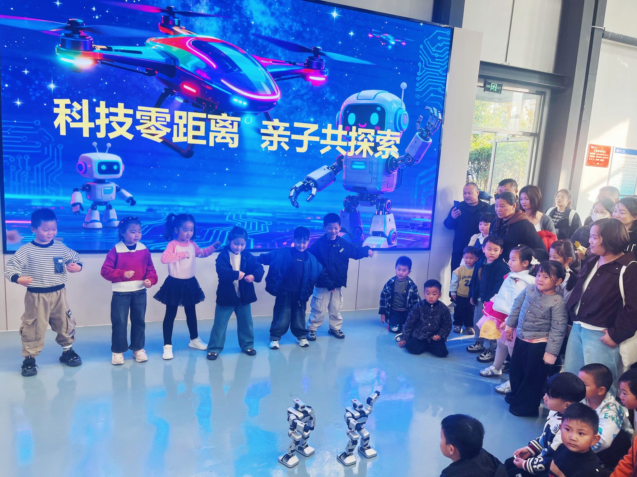 在机器人总动员环节,动感十足的音乐响起,两台机器人整齐划一地起舞,小朋友们纷纷踊跃模仿,伸臂、转头、摇摆……在快乐的模仿秀中感受着人工智能的韵律与精准。
