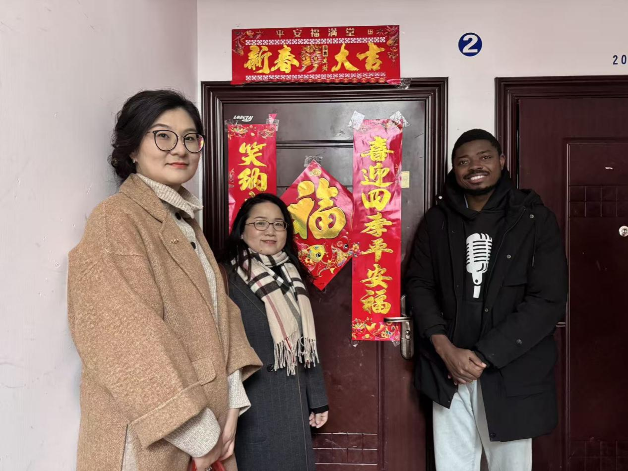 小年迎祥瑞,关怀暖人心。2月10日,正值农历小年,国际教育学院院长刘玉君、副院长于敏,留学生辅导员李众走访慰问寒假留校留学生,为远离家乡的国际学生送上新春祝福与节日慰问。