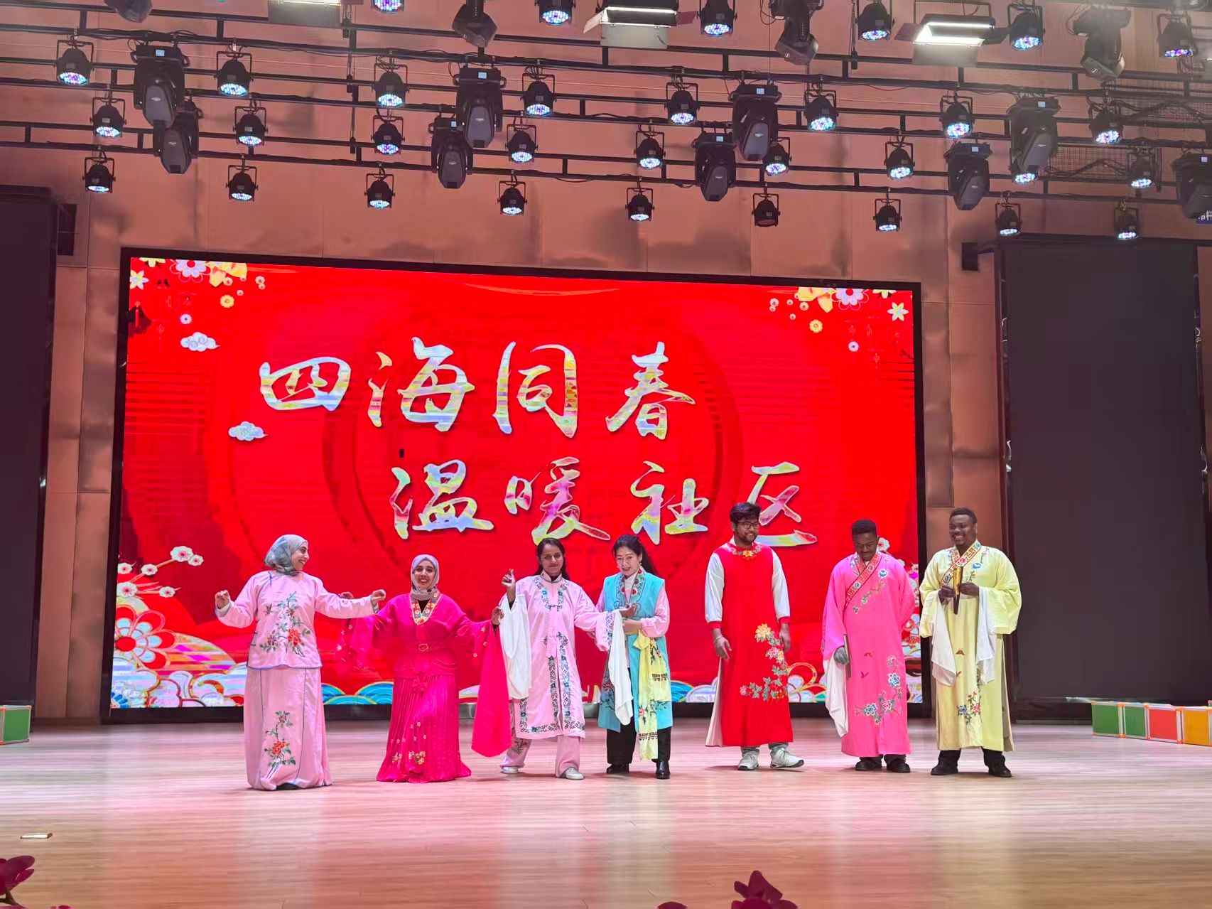 下午,中外学生与三门社区居民共同参与文艺展演。留学生们换上精美戏服,登台表演,沉浸式感受传统戏曲魅力;在民间艺人指导下,大家学习甩龙技艺,彩龙翻飞、活力满满,尽显民间手艺的灵动趣味。活动最后,留学生们共同演唱《新年好》,用中文送上新春祝福。