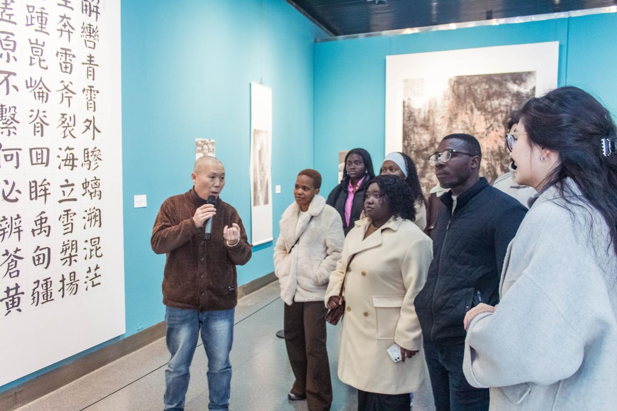 活动伊始,徐为零副馆长为现场中外学子带来了一场生动的艺术导赏。他结合馆内馆藏精品,详细介绍了淮安本土著名画家、书法家的艺术成就与作品风格,从笔墨意境到人文内涵,从创作背景到地域特色,让同学们在近距离欣赏艺术佳作的同时,深切感受淮安深厚的文化底蕴和艺术魅力。
